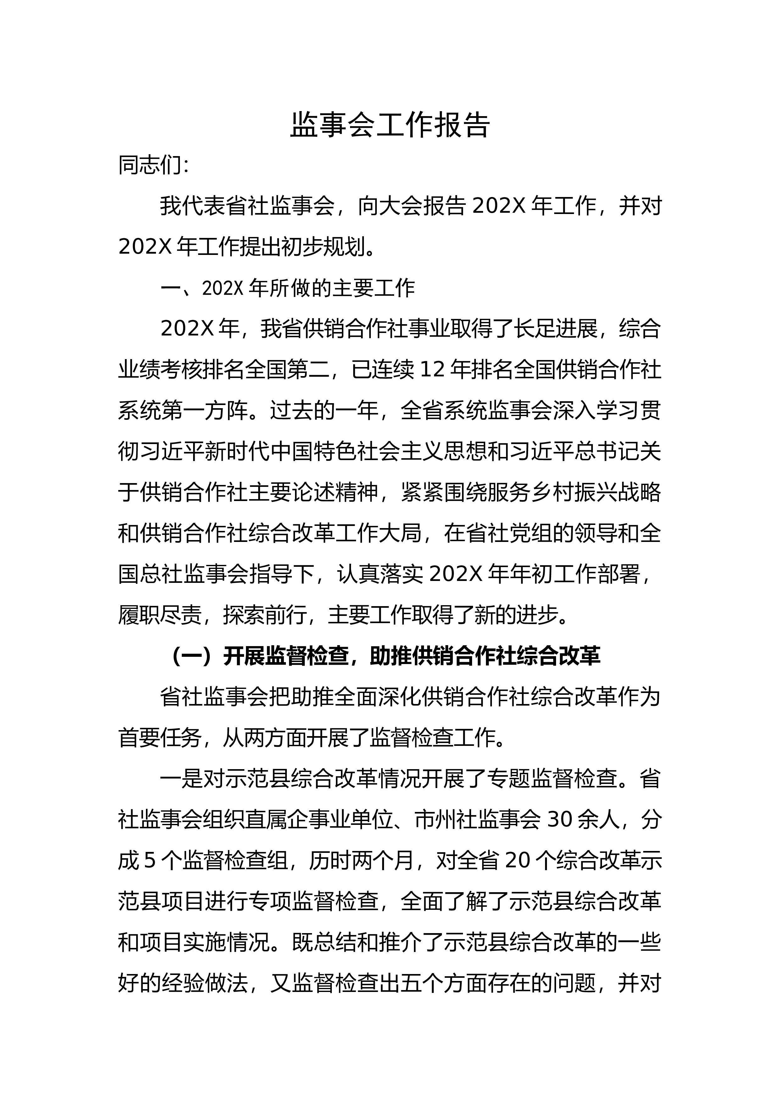 监事会工作报告同志们:我代表省社监事会,向大会报告202X年工作,并对202X年工作提出初步规划。一、202X年所做的主要工作202X年,我省供销合作社事业取得了长足进展,综合业绩考核排名全国第二,已连续12年排名全国供销合作社系统第一方阵。过去的一年,全省系统监事会深入学习贯彻习近平新时代中国特色社会主义思想和习近平总书记关于供销合作社主要论述精神,紧紧围绕服务乡村振兴战略和供销合作社综合改革工作大局,在省社党组的领导和全国总社监事会指导下,认真落实202X年年初工作部署,履职尽责,探索前行,主要工作取得了新的进步。(一)开展监督检查,助推供销合作社综合改革省社监事会把助推全面深化供销合作社...