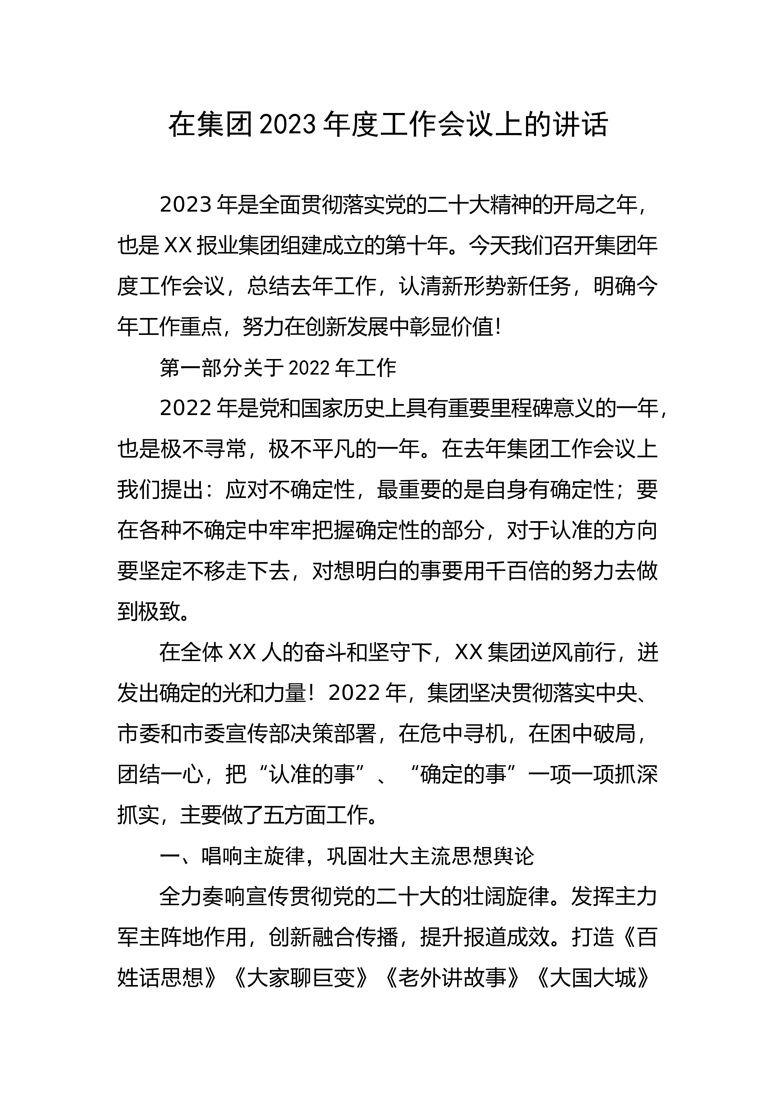 上的讲话2023年是全面贯彻落实党的二十大精神的开局之年,也是XX报业集团组建成立的第十年。今天我们召开集团年度