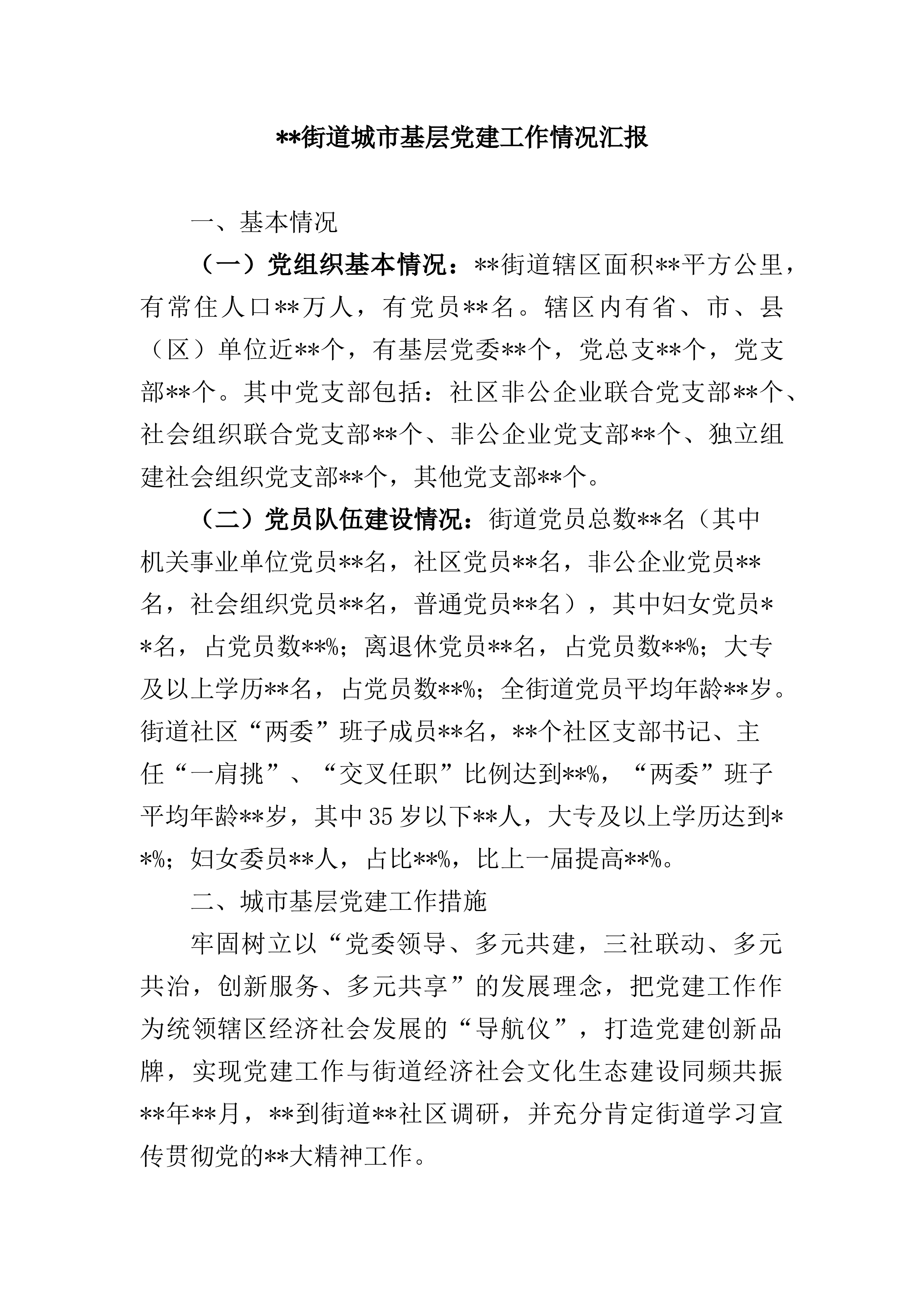 **街道城市基层党建工作情况汇报一、基本情况(一)党组织基本情况:**街道辖区面积**平方公里,有常住人口**万人,有党员**名。辖区内有省、市、县(区)单位近**个,有基层党委**个,党总支**个,党支部**个。其中党支部包括:社区非公企业联合党支部**个、社会组织联合党支部**个、非公企业党支部**个、独立组建社会组织党支部**个,其他党支部**个。(二)党员队伍建设情况:街道党员总数**名(其中机关事业单位党员**名,社区党员**名,非公企业党员**名,社会组织党员**名,普通党员**名),其中妇女党员**名,占党员数**%;离退休党员**名,占党员数**%;大专及以上学历**名,占党员...