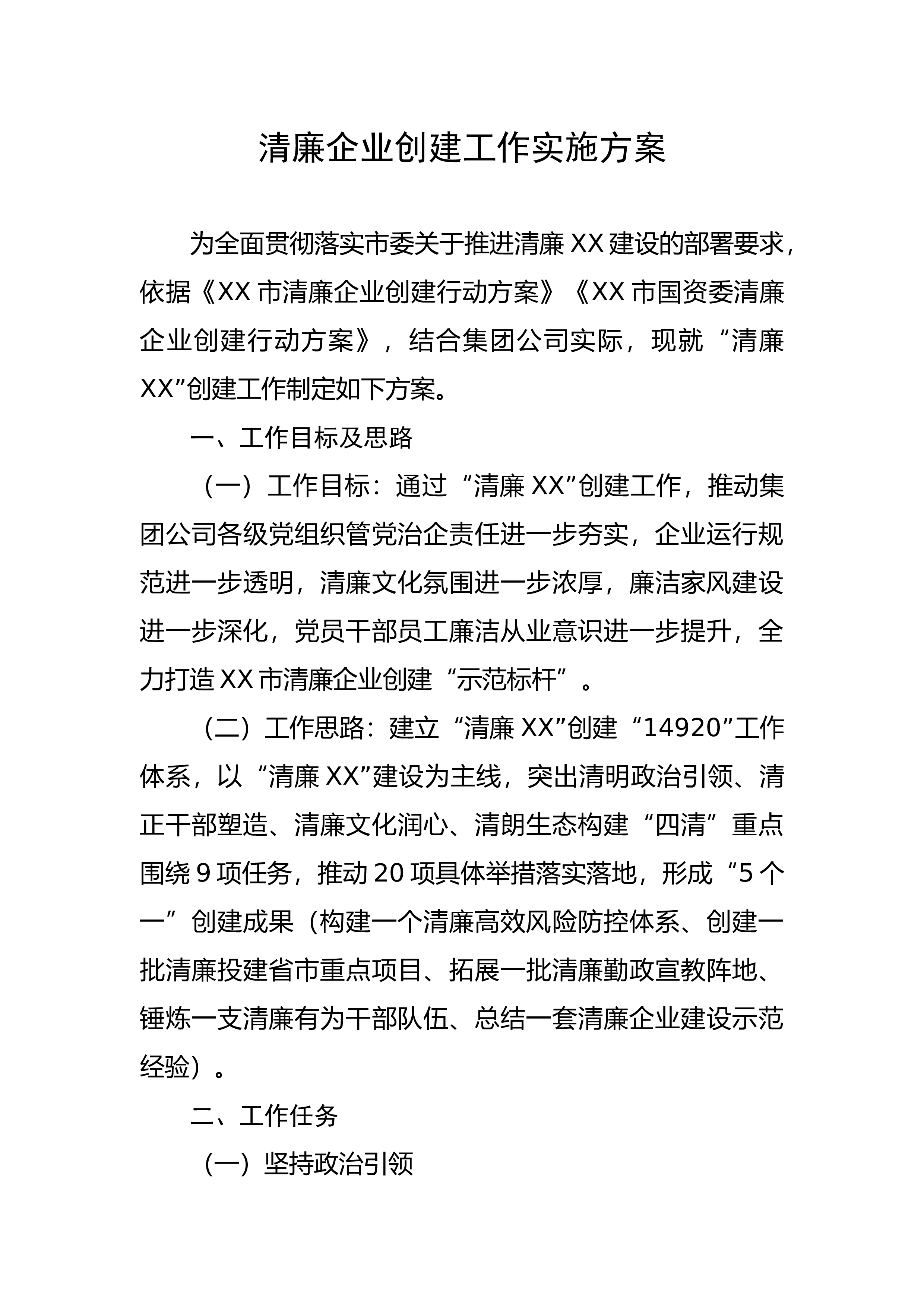 清廉企业创建工作实施方案为全面贯彻落实市委关于推进清廉XX建设的部署要求,依据《XX市清廉企业创建行动方案》《XX市国资委清廉企业创建行动方案》,结合集团公司实际,现就“清廉XX”创建工作制定如下方案。一、工作目标及思路(一)工作目标:通过“清廉XX”创建工作,推动集团公司各级党组织管党治企责任进一步夯实,企业运行规范进一步透明,清廉文化氛围进一步浓厚,廉洁家风建设进一步深化,党员干部员工廉洁从业意识进一步提升,全力打造XX市清廉企业创建“示范标杆”。(二)工作思路:建立“清廉XX”创建“14920”工作体系,以“清廉XX”建设为主线,突出清明政治引领、清正干部塑造、清廉文化润心、清朗生态构建...