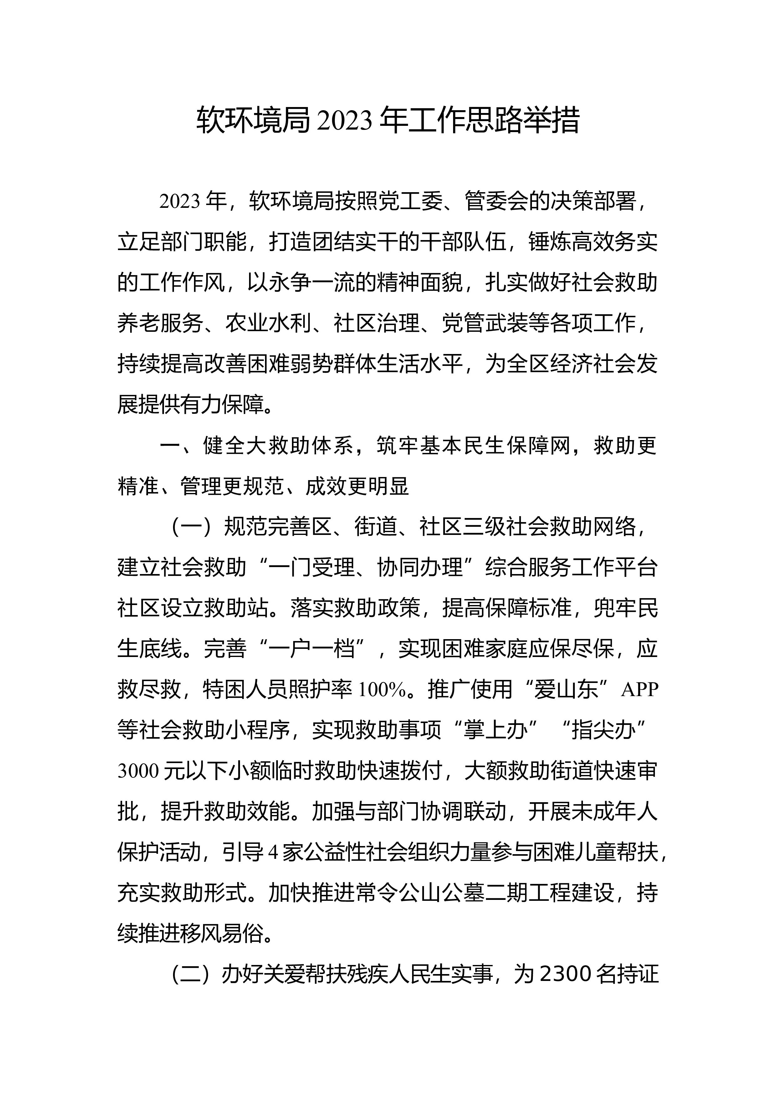 软环境局2023年工作思路举措2023年,软环境局按照党工委、管委会的决策部署,立足部门职能,打造团结实干的干部队伍,锤炼高效务实的工作作风,以永争一流的精神面貌,扎实做好社会救助养老服务、农业水利、社区治理、党管武装等各项工作,持续提高改善困难弱势群体生活水平,为全区经济社会发展提供有力保障。一、健全大救助体系,筑牢基本民生保障网,救助更精准、管理更规范、成效更明显(一)规范完善区、街道、社区三级社会救助网络,建立社会救助“一门受理、协同办理”综合服务工作平台社区设立救助站。落实救助政策,提高保障标准,兜牢民生底线。完善“一户一档”,实现困难家庭应保尽保,应救尽救,特困人员照护率100%。推...