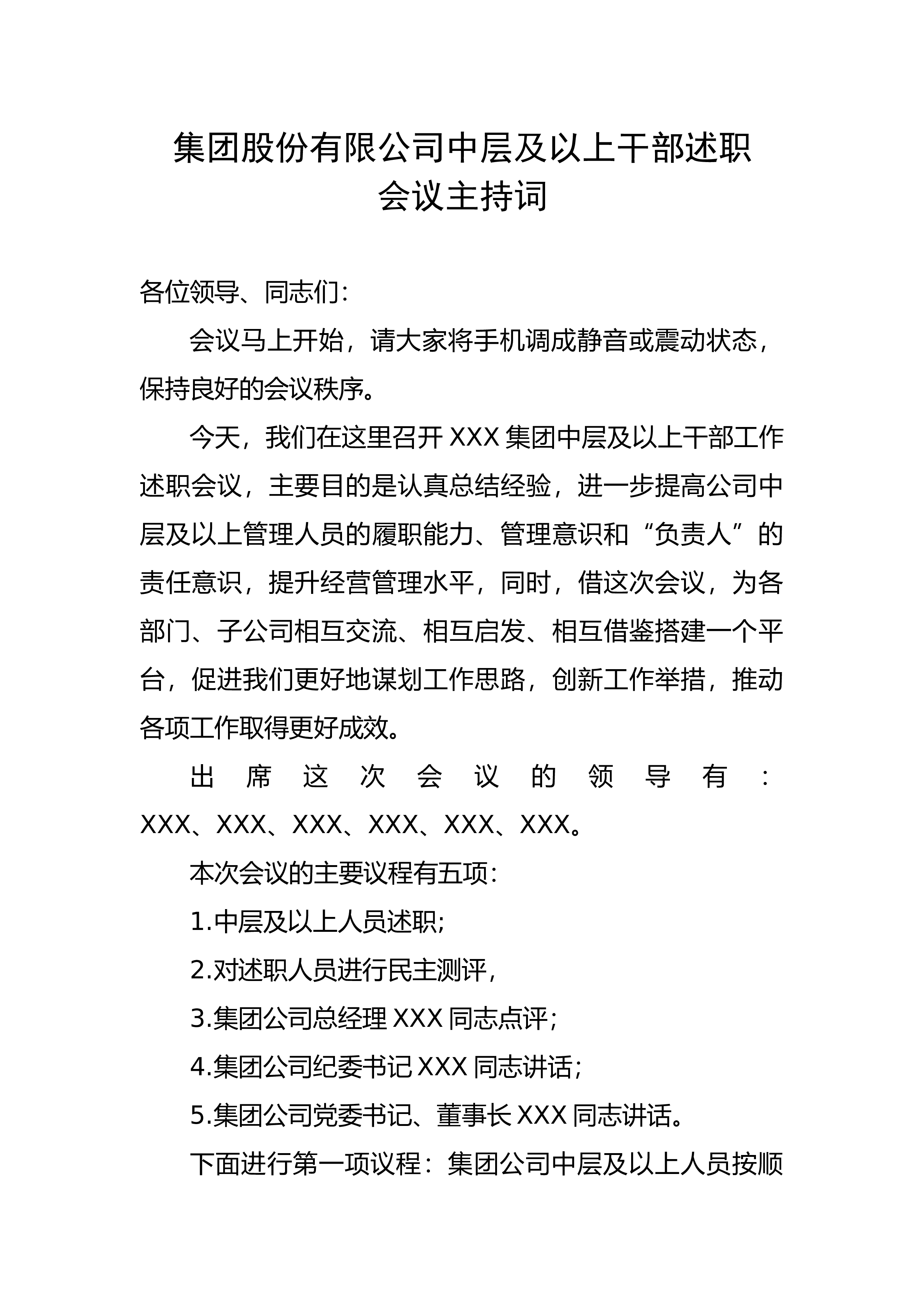 集团股份有限公司中层及以上干部述职会议主持词各位领导、同志们:会议马上开始,请大家将手机调成静音或震动状态,保持良好的会议秩序。今天,我们在这里召开XXX集团中层及以上干部工作述职会议,主要目的是认真总结经验,进一步提高公司中层及以上管理人员的履职能力、管理意识和“负责人”的责任意识,提升经营管理水平,同时,借这次会议,为各部门、子公司相互交流、相互启发、相互借鉴搭建一个平台,促进我们更好地谋划