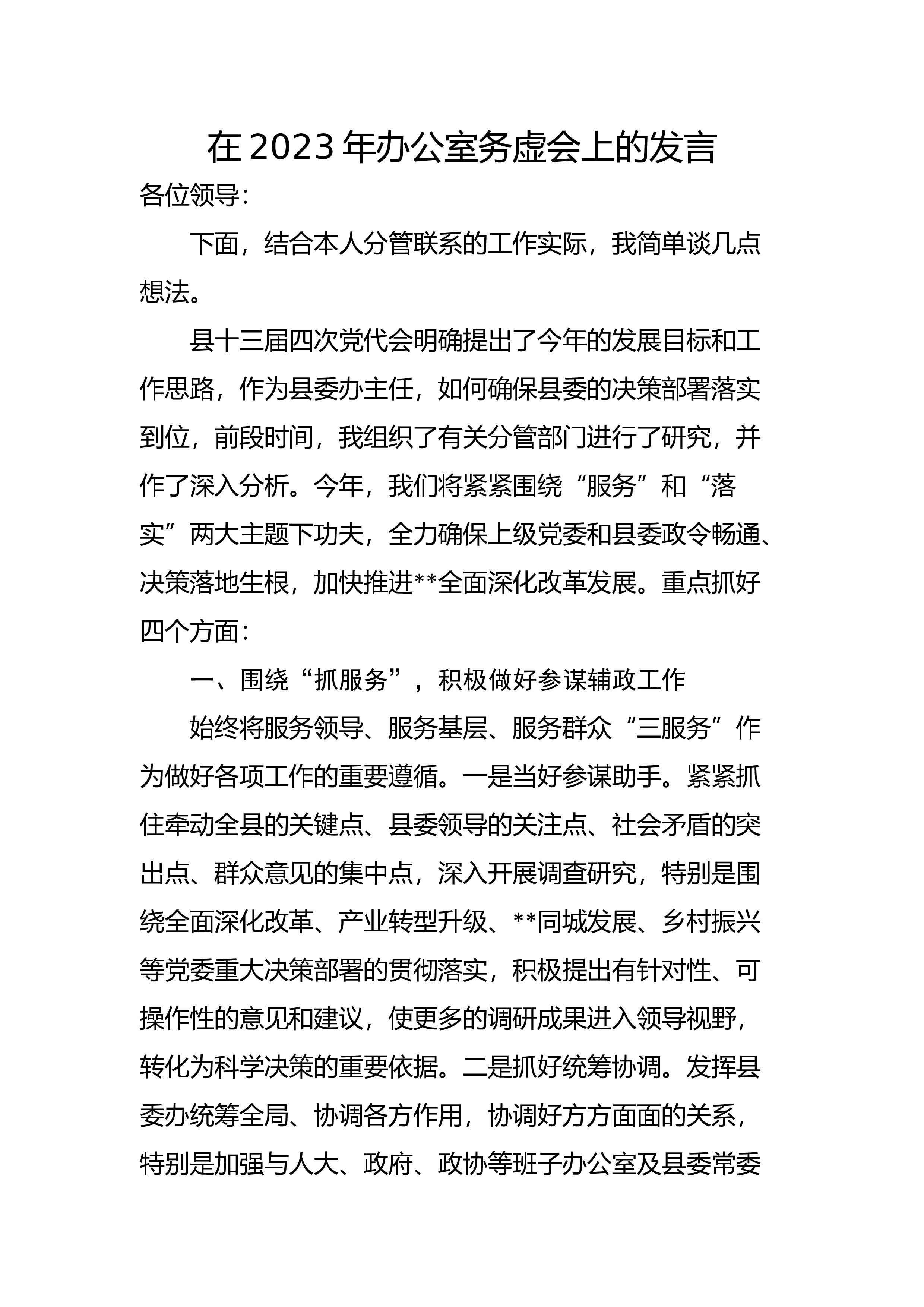 在2023年办公室务虚会上的发言各位领导:下面,结合本人分管联系的工作实际,我简单谈几点想法。县十三届四次党代会明确提出了今年的发展目标和
