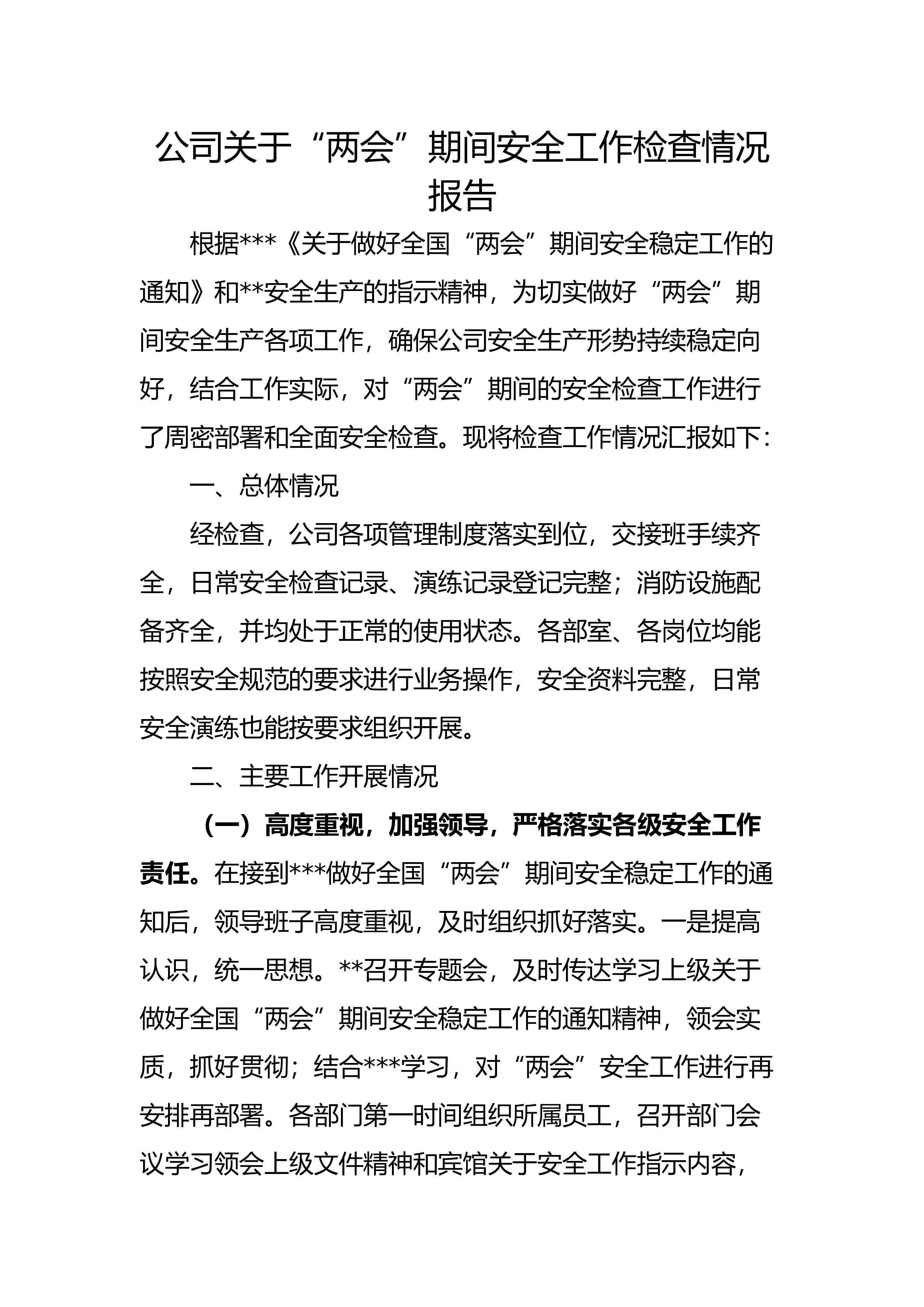 【两会】公司关于“两会”期间安全工作检查情况报告