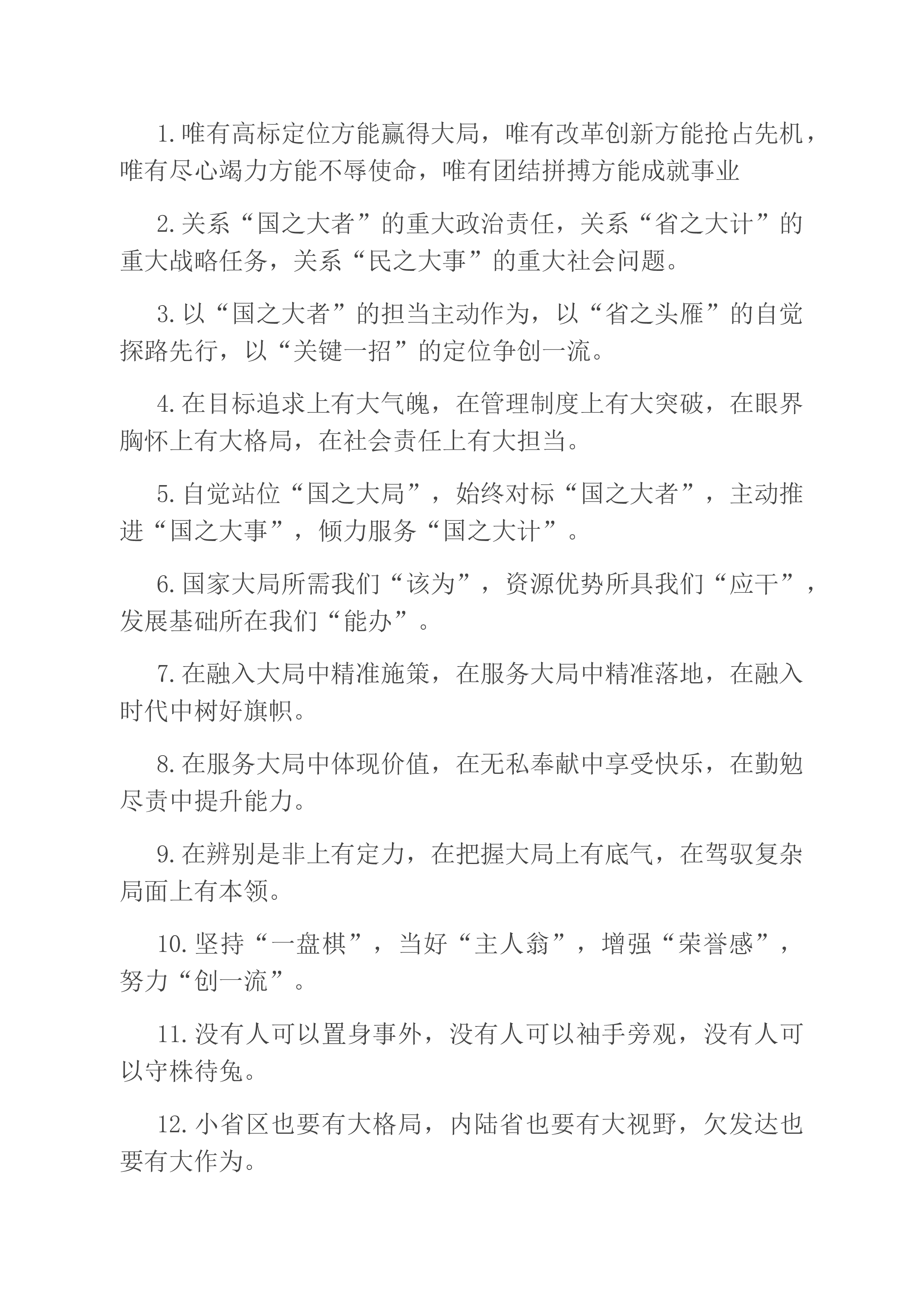 1.唯有高标定位方能赢得大局,唯有改革创新方能抢占先机,唯有尽心竭力方能不辱使命,唯有团结拼搏方能成就事业2.关系“国之大者”的重大政治责任,关系“省之大计”的重大战略任务,关系“民之大事”的重大社会问题。3.以“国之大者”的担当主动作为,以“省之头雁”的自觉探路先行,以“关键一招”的定位争创一流。4.在目标追求上有大气魄,在