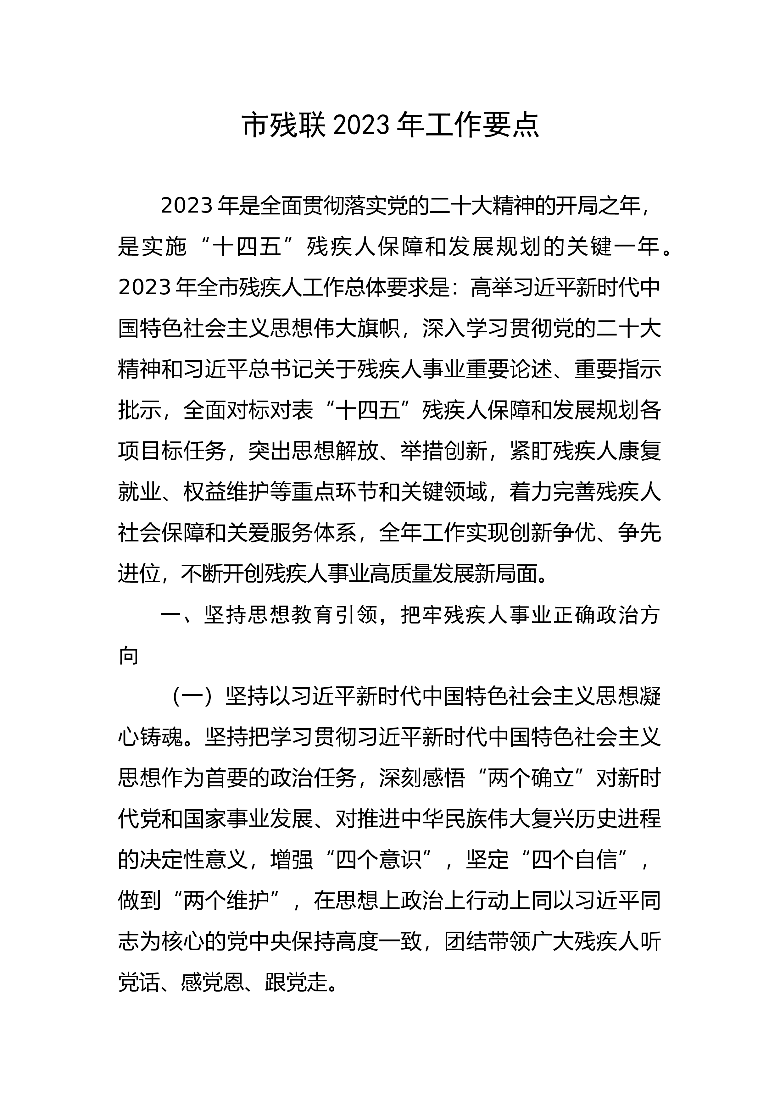 市残联2023年工作要点2023年是全面贯彻落实党的二十大精神的开局之年,是实施“十四五”残疾人保障和发展规划的关键一年。2023年全市残疾人工作总体要求是:高举习近平新时代中国特色社会主义思想伟大旗帜,深入学习贯彻党的二十大精神和习近平总书记关于残疾人事业重要论述、重要指示批示,全面对标对表“十四五”残疾人保障和发展规划各项目标任务,突出思想解放、举措创新,紧盯残疾人康复就业、权益维护等重点环节和关键领域,着力完善残疾人社会保障和关爱服务体系,全年工作实现创新争优、争先进位,不断开创残疾人事业高质量发展新局面。一、坚持思想教育引领,把牢残疾人事业正确政治方向(一)坚持以习近平新时代中国特色社...