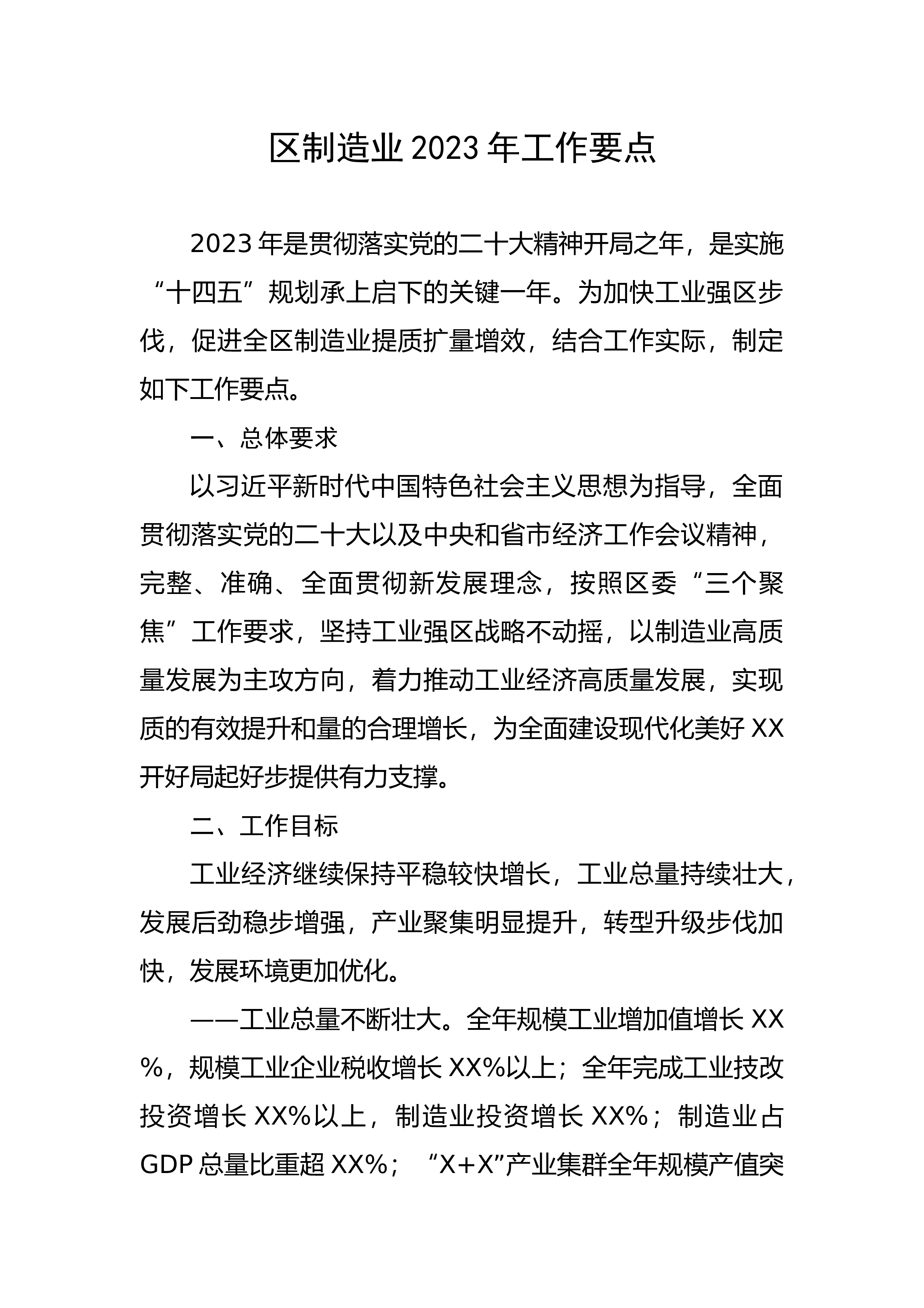 承上启下的关键一年。为加快工业强区步伐,促进全区制造业提质扩量增效,结合工作实际,制定如下工作要点。一、总体要求以习近平新时代中国特色社会主义思想为指导,全面贯彻落实党的二十大以及中央和省市经济工作会议精神,完整、准确、全面贯彻新发展理念,按照区委“三个聚焦”工作要求,坚持工业强区战略不动摇,以制造业高质量发展为主攻方向,着力推动工业经济高质量发展,实现质的有效提升和量的合理增长,为全面建设现代化美好XX开好局起好步提供有力支撑。二、工作目标工业经济继续保持平稳较快增长,工业总量持续壮大,发展后劲稳步增强...