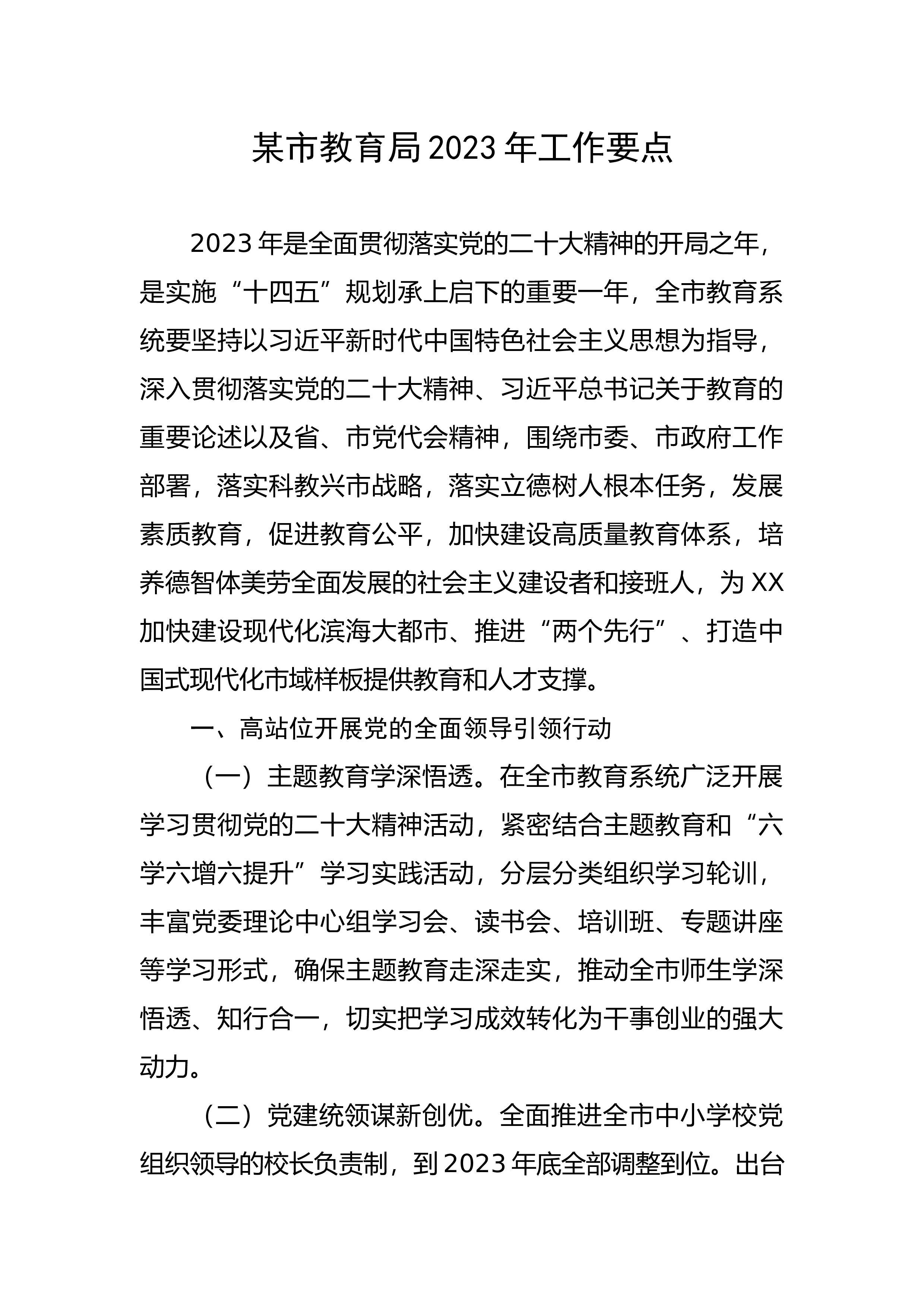 承上启下的重要一年,全市教育系统要坚持以习近平新时代中国特色社会主义思想为指导,深入贯彻落实党的二十大精神、习近平总书记关于教育的重要论述以及省、市党代会精神,围绕市委、市政府工作部署,落实科教兴市战略,落实立德树人根本任务,发展素质教育,促进教育公平,加快建设高质量教育体系,培养德智体美劳全面发展的社会主义建设者和接班人,为XX加快建设现代化滨海大都市、推进“两个先行”、打造中国式现代化市域样板提供教育和人才支撑。一、高站位开展党的全面领导引领行动(一)主T教育学深悟透。在全市教育系统广泛开展学...
