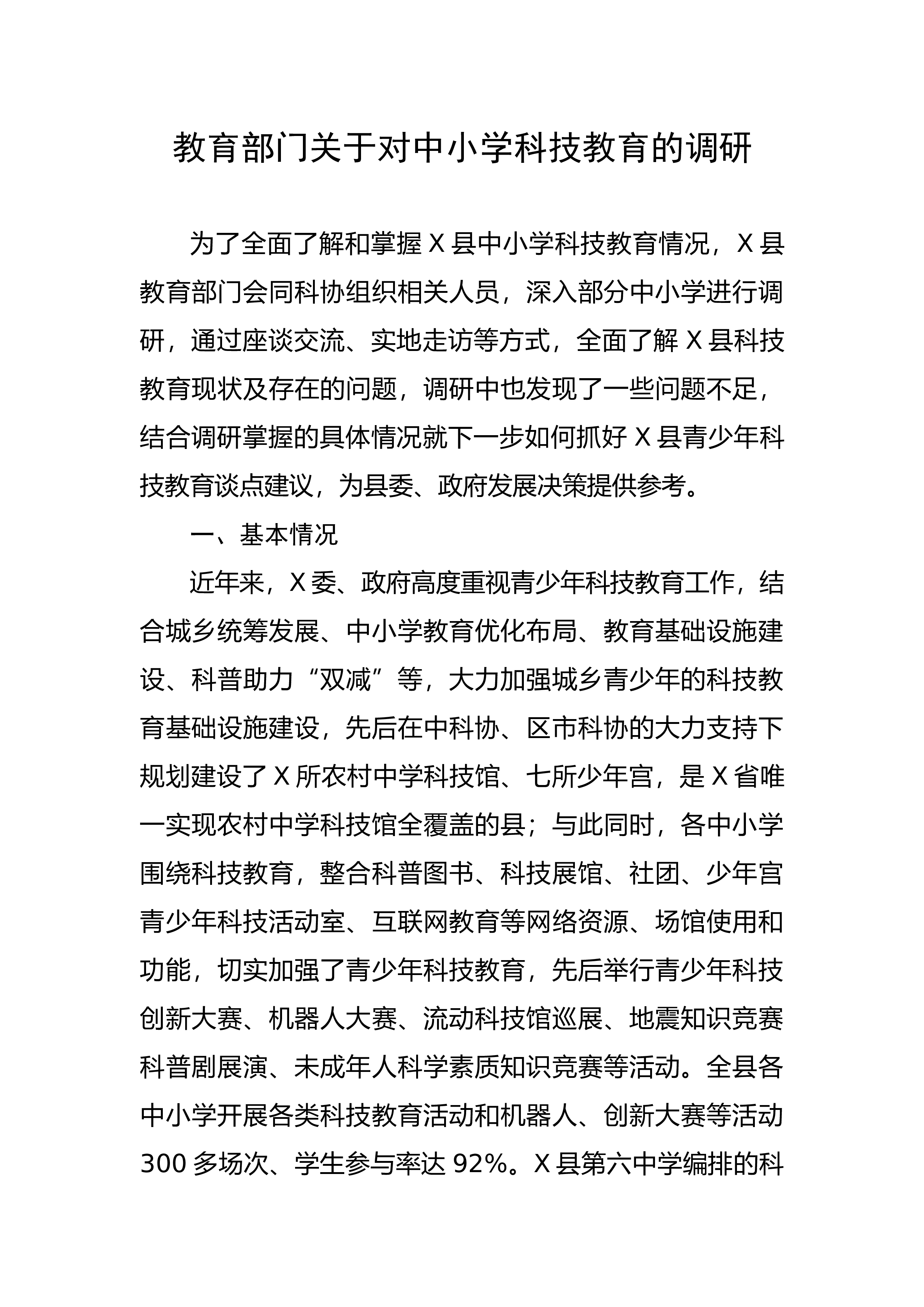 教育部门关于对中小学科技教育的调研为了全面了解和掌握X县中小学科技教育情况,X县教育部门会同科协组织相关人员,深入部分中小学进行调研,通过座谈交流、实地走访等方式,全面了解X县科技教育现状及存在的问题,调研中也发现了一些问题不足,结合调研掌握的具体情况就下一步如何抓好X县青少年科技教育谈点建议,为县委、政府发展决策提供参考。一、基本情况近年来,X委、政府高度重视青少年科技教育工作,结合城乡统筹发展、中小学教育优化布局、教育基础设施建设、科普助力“双减”等,大力加强城乡青少年的科技教育基础设施建设,先后在中科协、区市科协的大力支持下