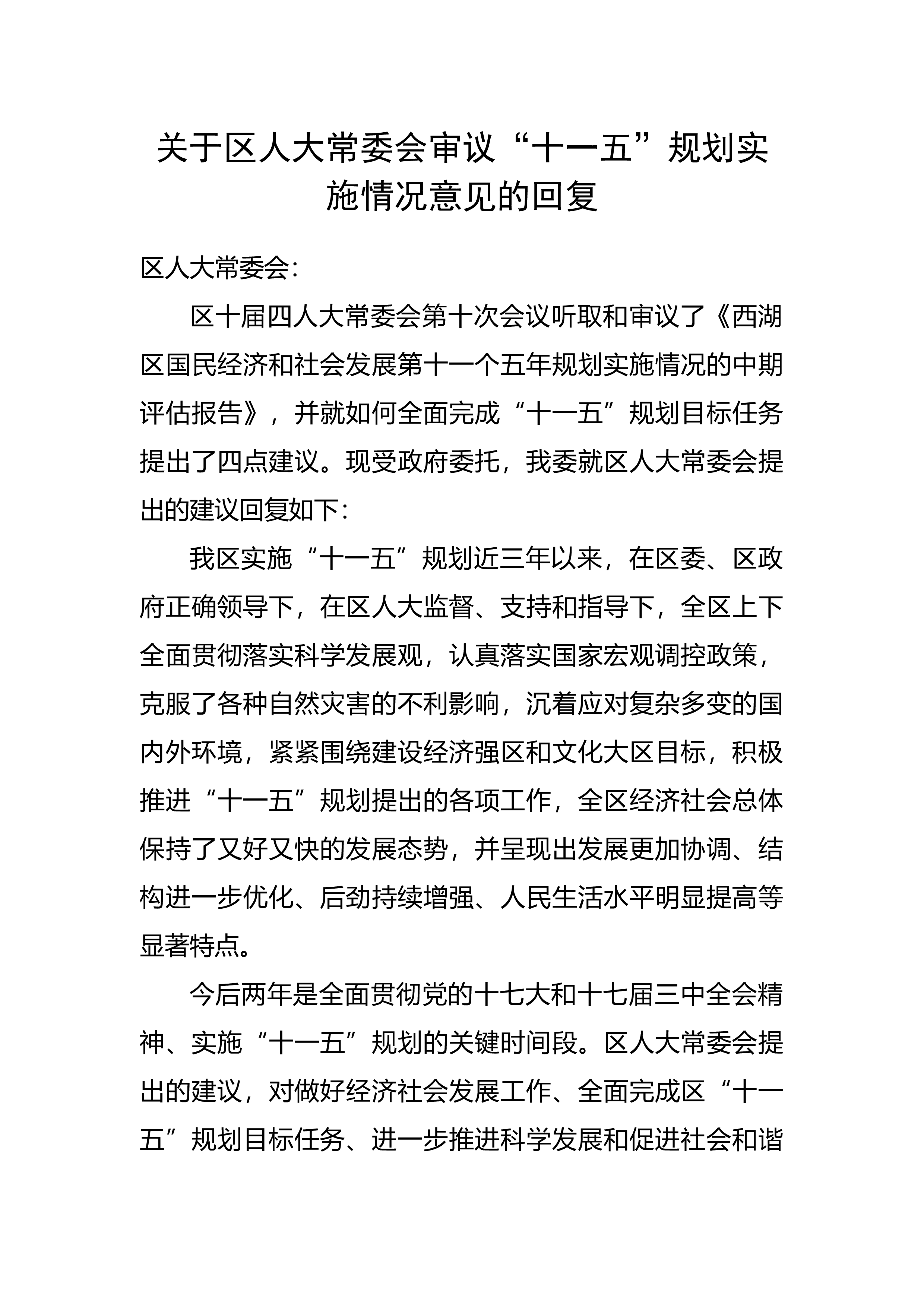 实施情况意见的回复区人大常委会:区十届四人大常委会第十次会议听取和审议了《西湖区国民经济和社会发展第十一个五年