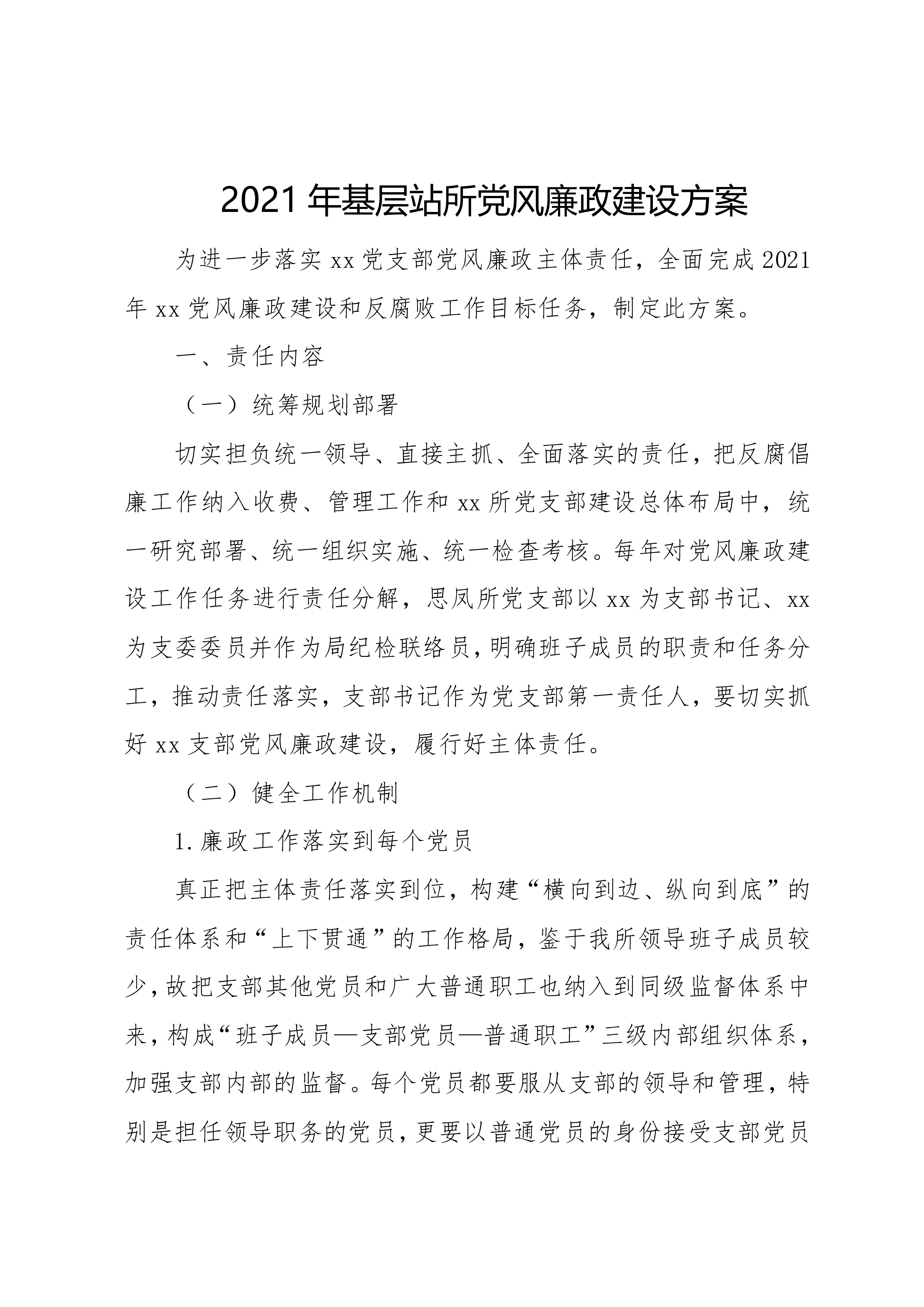 2021年基层站所党风廉政建设方案为进一步落实xx党支部党风廉政主体责任,全面完成2021年xx党风廉政建设和反腐败工作目标任务,制定此方案。一、责任内容(一)统筹