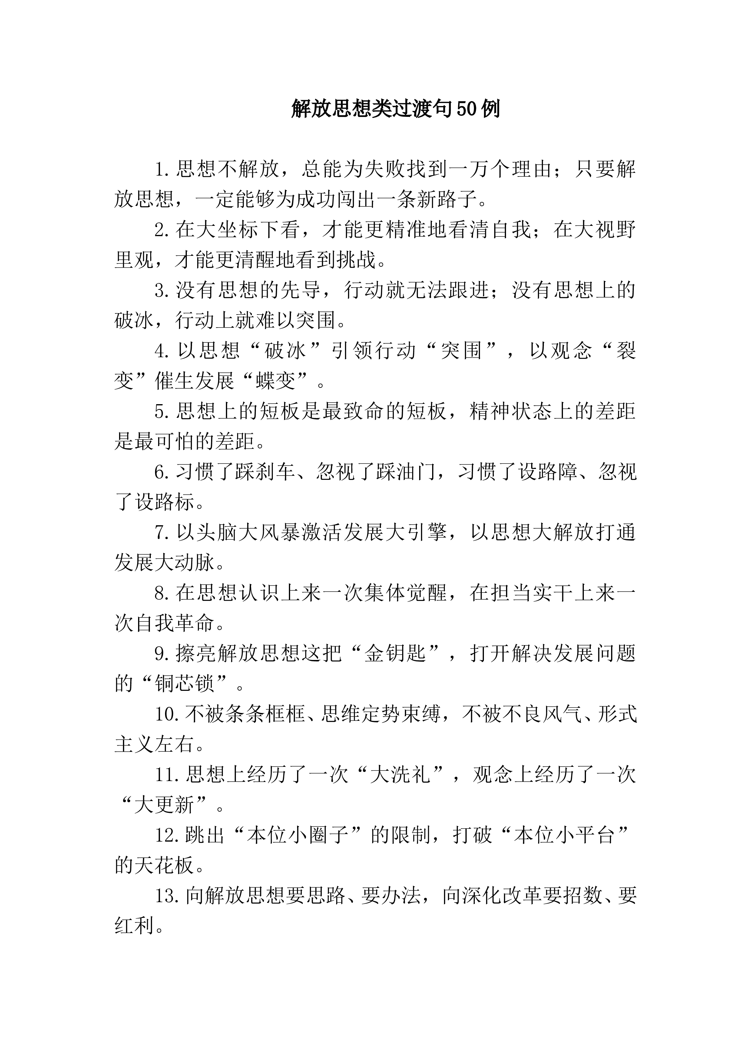 过渡句50例(2023年12月28日)1.少走有准备的“规定路线”看“门面”、看“窗口”,多走随机性的“自选路线”看“后院”、看“角落”。2.在调查研究中寻觅源头活水、获得真知灼见,在调查研究中夯实谋事之基、遵循成事之道。3.在细致入微的调查研究中明思路、强举措,在动真碰硬的整改整治中疏堵点、补短板。4.把一张张“问题清单”变为“成果清单”,把一份份“调研成果”化为“发展成果”。5.对反复出现的问题注重从制度上找原因,对多点发生的问题注重从规律上找根源。6.用独到的眼光对事态的发展明察秋毫,用细腻的观察对事情的结局未雨绸缪。7.打开局面、破解难题的重要手段,摸清情况、正确决策的关键环节。8.弄...