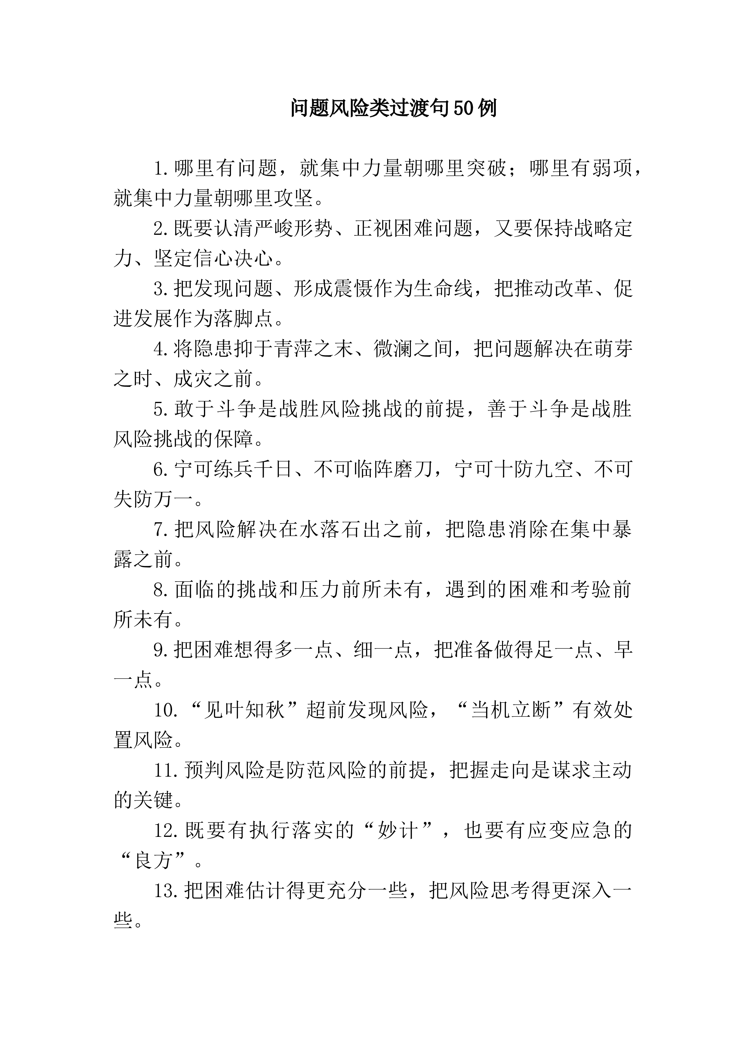 过渡句50例(2023年11月24日)1.用青春的激情奏响了“清澈的爱、只为中国”的时代强音,用青春的行动践行了“请党放心、强国有我”的铮铮誓言。2.敢于把矛盾和阻力当大熔炉,把自己炼成坚硬的钢铁;善于把困难和问题当磨刀石,把自己磨成锋利的快刀。3.少一些自以为是的“自我设计”、自行其是的上攀下附,多一些慎独慎微的“自我敲打”、清清爽爽的同志关系。4.既不因一事之成、一时之功而沾沾自喜、松劲歇脚,也不因任务艰巨、前路漫漫而灰心丧气、畏难厌战。5.青春活力转化为攻坚克难、攀登高峰的过硬能力,青春气质转化为锐意进取、担当有为的优秀品质。6.既有“一张白纸好作画”的豪情万丈,更有“不待扬鞭自奋蹄”的...