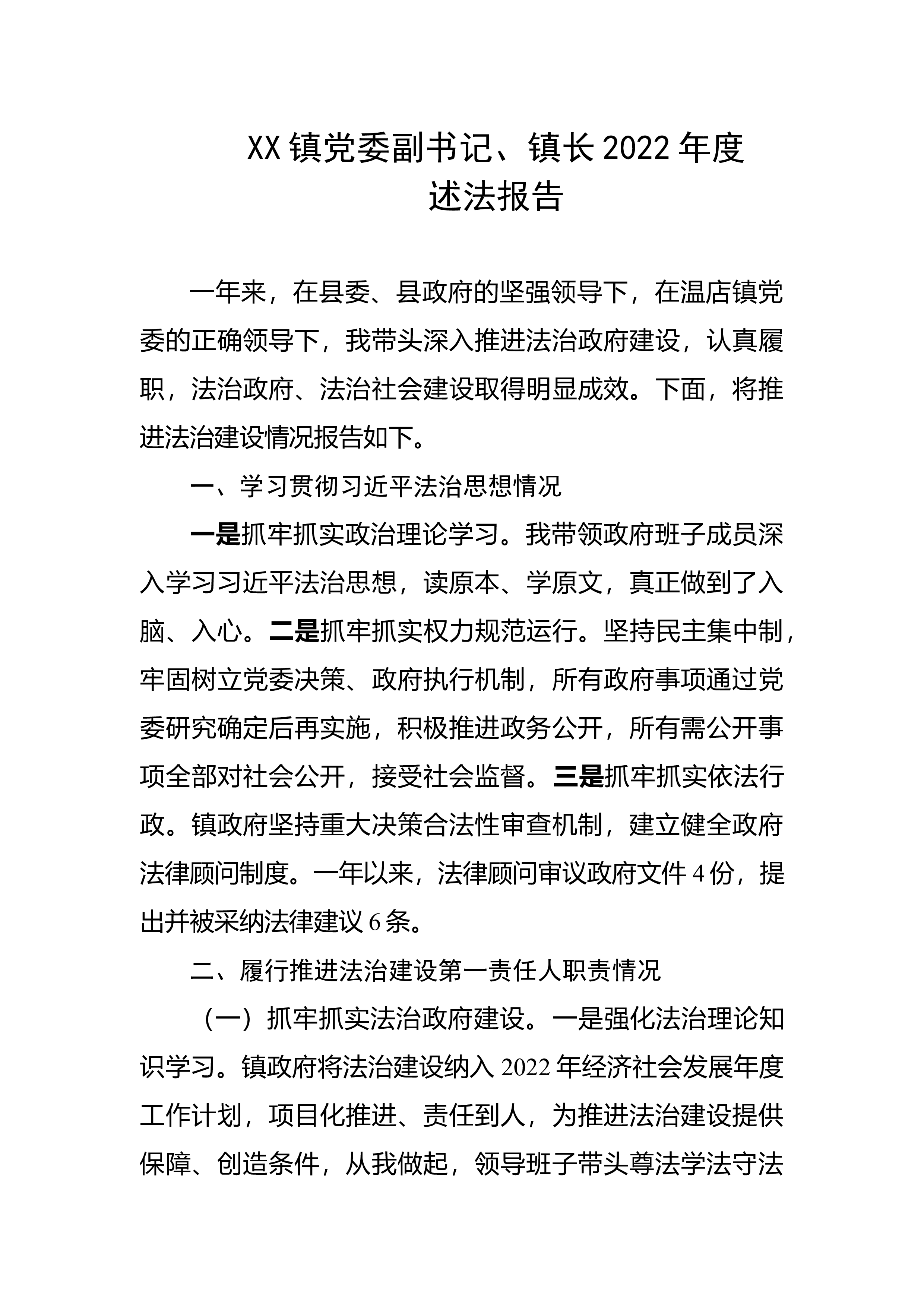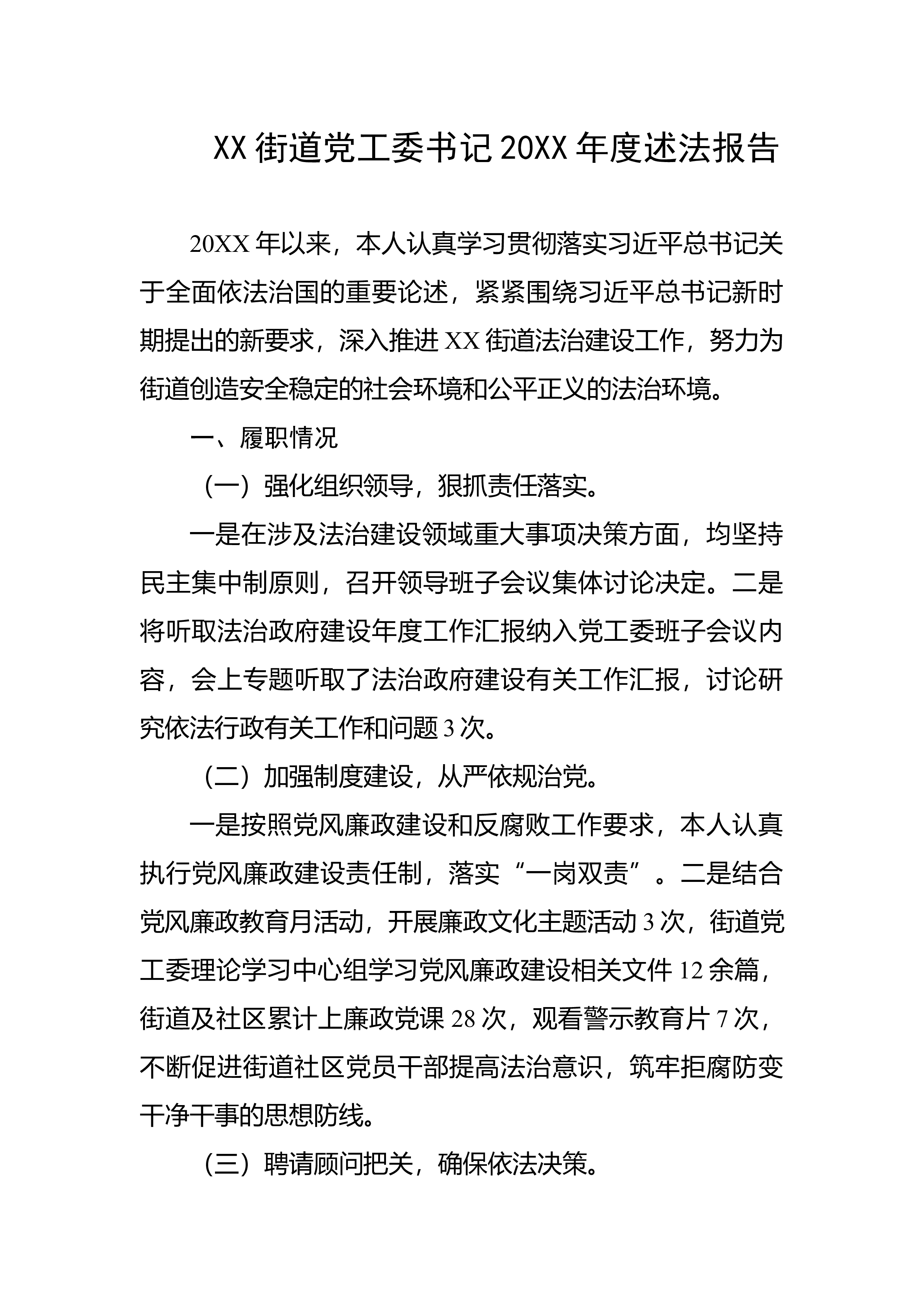 XX街道党工委书记20XX年度述法报告20XX年以来,本人认真学习贯彻落实习近平总书记关于全面依法治国的重要论述,紧紧围绕习近平总书记新时期提出的新要求,深入推进XX街道法治建设工作,努力为街道创造安全稳定的社会环境和公平正义的法治环境。一、履职情况(一)强化组织领导,狠抓责任落实。一是在涉及法治建设领域重大事项决策方面,均坚持民主集中制原则,召开领导班子会议集体讨论决定。二是将听取法治政府建设年度工作汇报纳入党工委班子会议内容,会上专题听取了法治政府建设有关工作汇报,讨论研究依法行政有关工作和问题3次。(二)加强制度建设,从严依规治党。一是按照党风廉政建设和反腐败工作要求,本人认真执行党风廉...