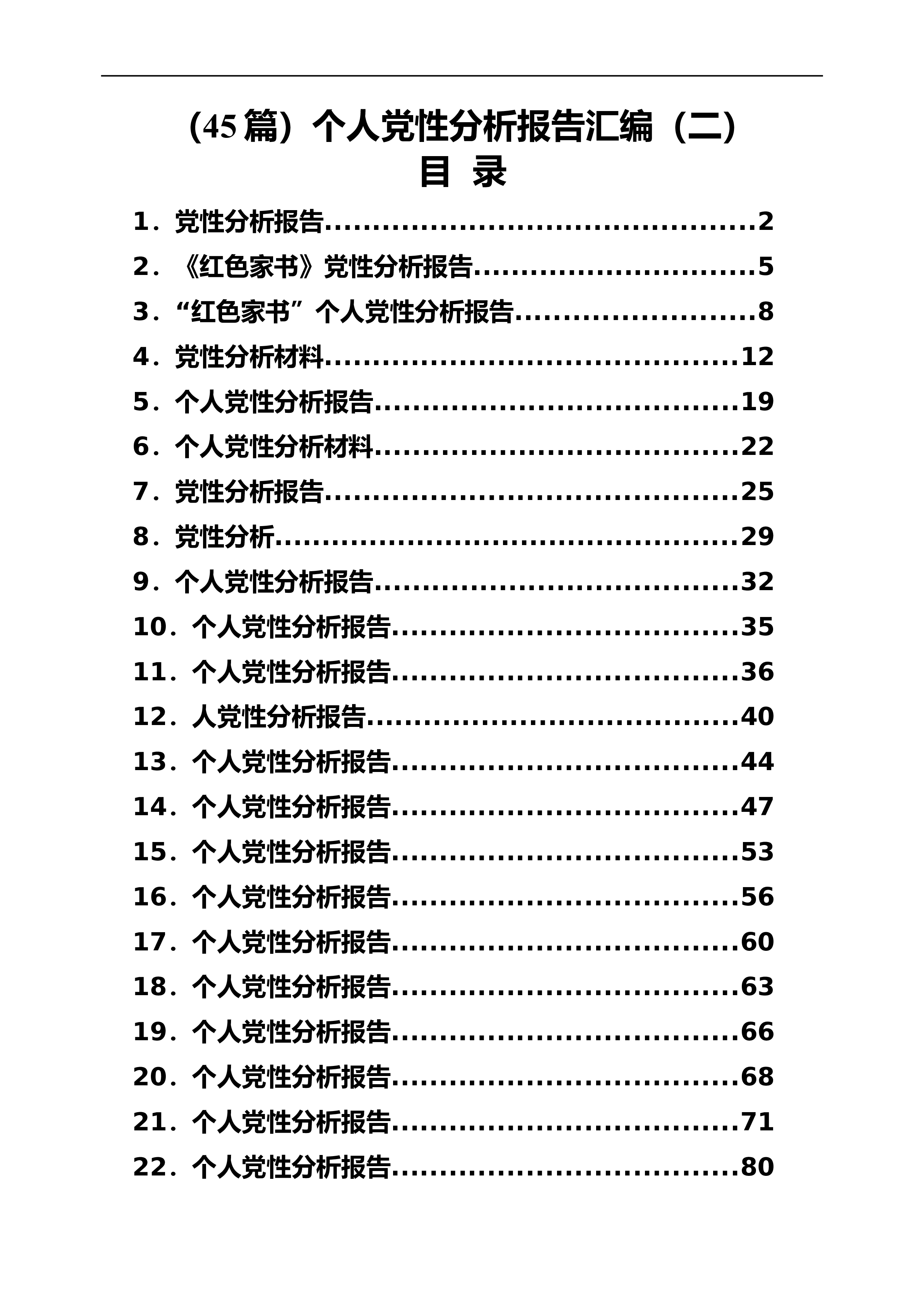 (45篇)个人党性分析报告汇编(二)目录1.党性分析报告.............................................22.《红色家书》党性分析报告..............................53.“红色家书”个人党性分析报告.........................84.党性分析材料...........................................125.个人党性分析报告......................................196.个人党性分析材料.............................