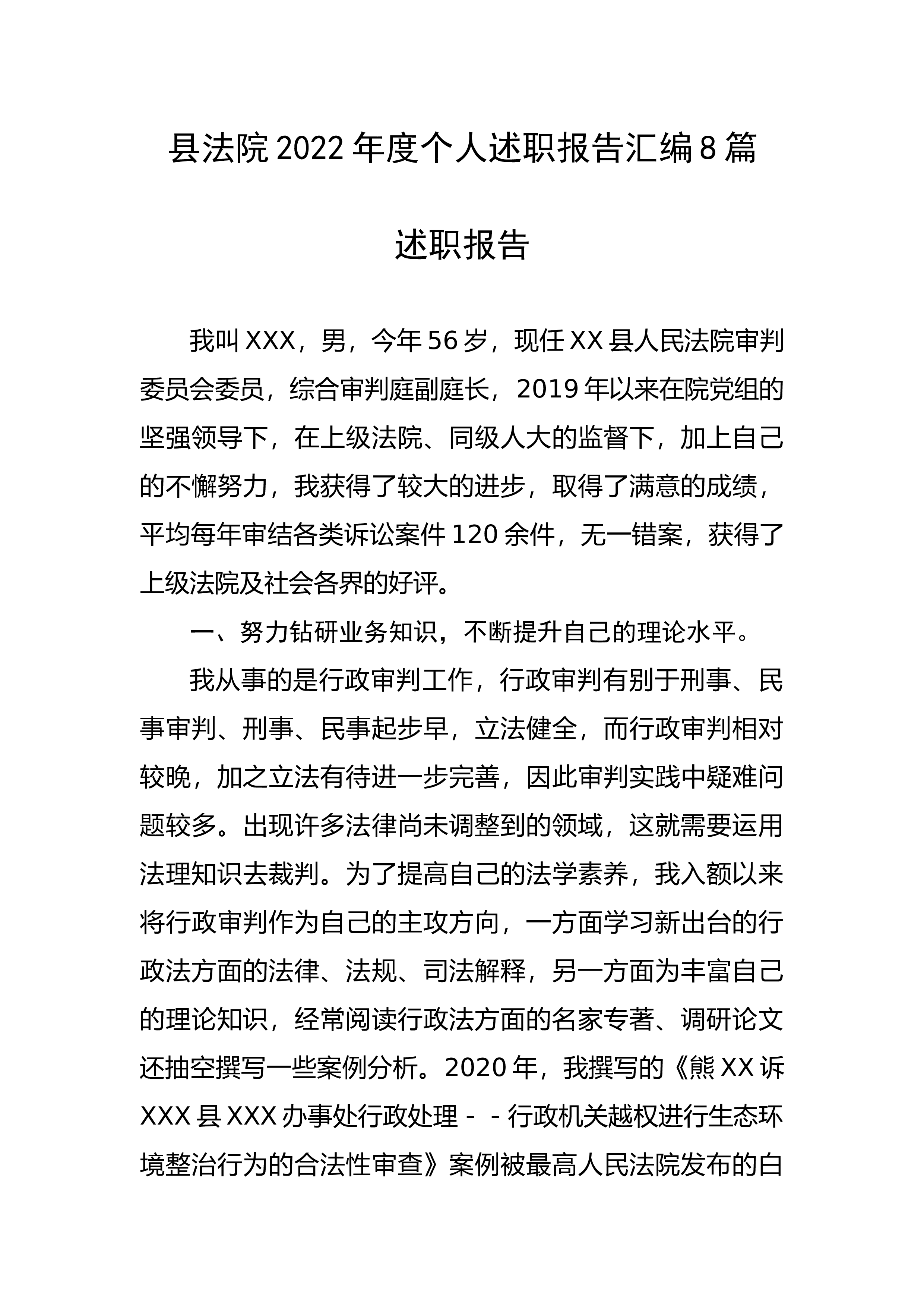 8篇述职报告我叫XXX,男,今年56岁,现任XX县人民法院审判委员会委员,综合审判庭副庭长,2019年以来在院党组的坚强领导下,在上级法院、同级人大的监督下,加上自己的不懈努力,我获得了较大的进步,取得了满意的成绩,平均每年审结各类诉讼案件120余件,无一错案,获得了上级法院及社会各界的好评。一、努力钻研业务知识,不断提升自己的理论水平。我从事的是行政审判工作,行政审判有别于刑事、民事审判、刑事、民事起步早,立法健全,而行政审判相对较晚,加之立法有待进一步完善,因此审判实践中疑难问题较多。出现许多法律尚未调整到的领域,这就需要运用法理知识去裁判。为了提高自己的...