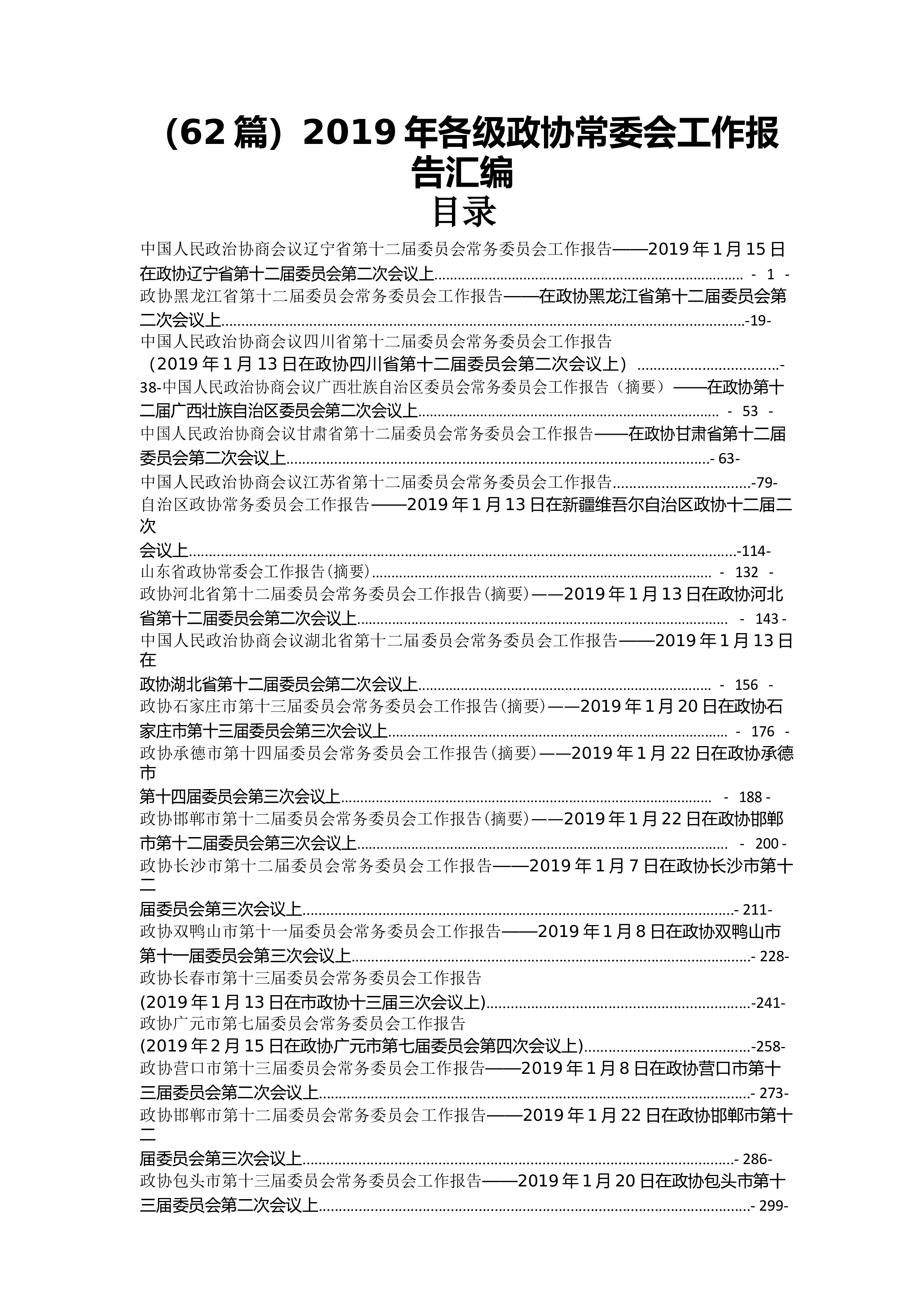 (62篇)2019年各级政协常委会工作报告汇编目录中国人民政治协商会议辽宁省第十二届委员会常务委员会工作报告——2019年1月15日在政协辽宁省第十二届委员会第二次会议上................................................................................-1-政协黑龙江省第十二届委员会常务委员会工作报告——在政协黑龙江省第十二届委员会第二次会议上...........................................................................................