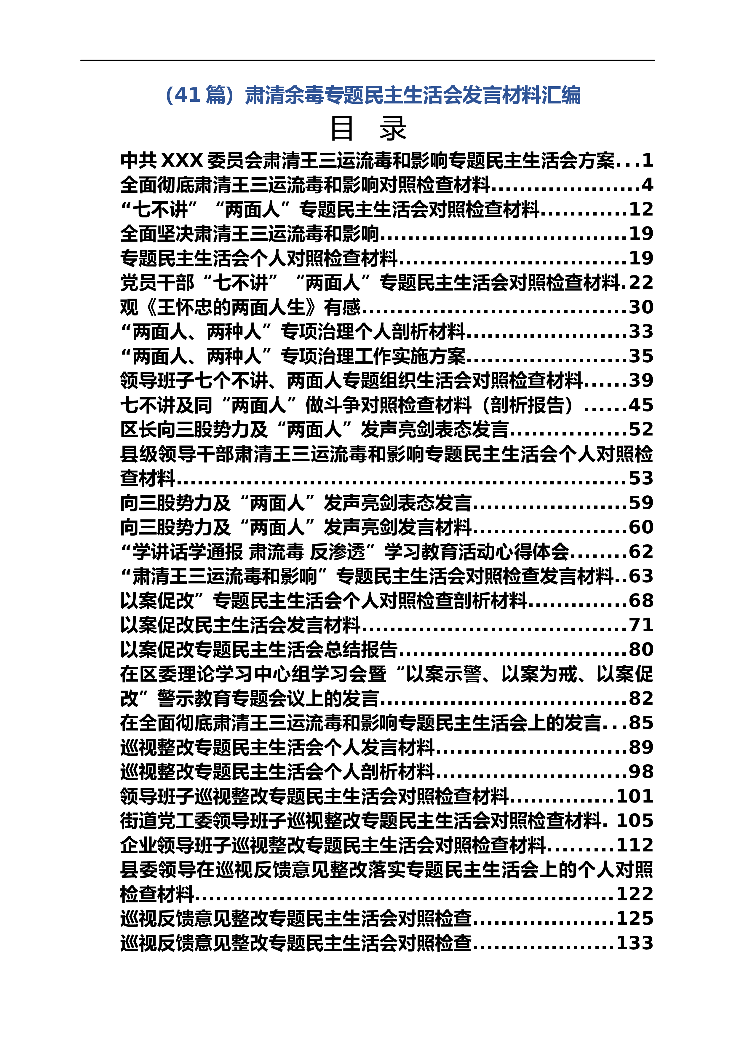 (41篇)肃清余毒专题民主生活会发言材料汇编目录中共XXX委员会肃清王三运流毒和影响专题民主生活会方案...1全面彻底肃清王三运流毒和影响对照检查材料.....................4“七不讲”“两面人”专题民主生活会对照检查材料............12全面坚决肃清王三运流毒和影响...................................19专题民主生活会个人对照检查材料................................19党员干部“七不讲”“两面人”专题民主生活会对照检查材料.22观《王怀忠的两面人生》有感..........................