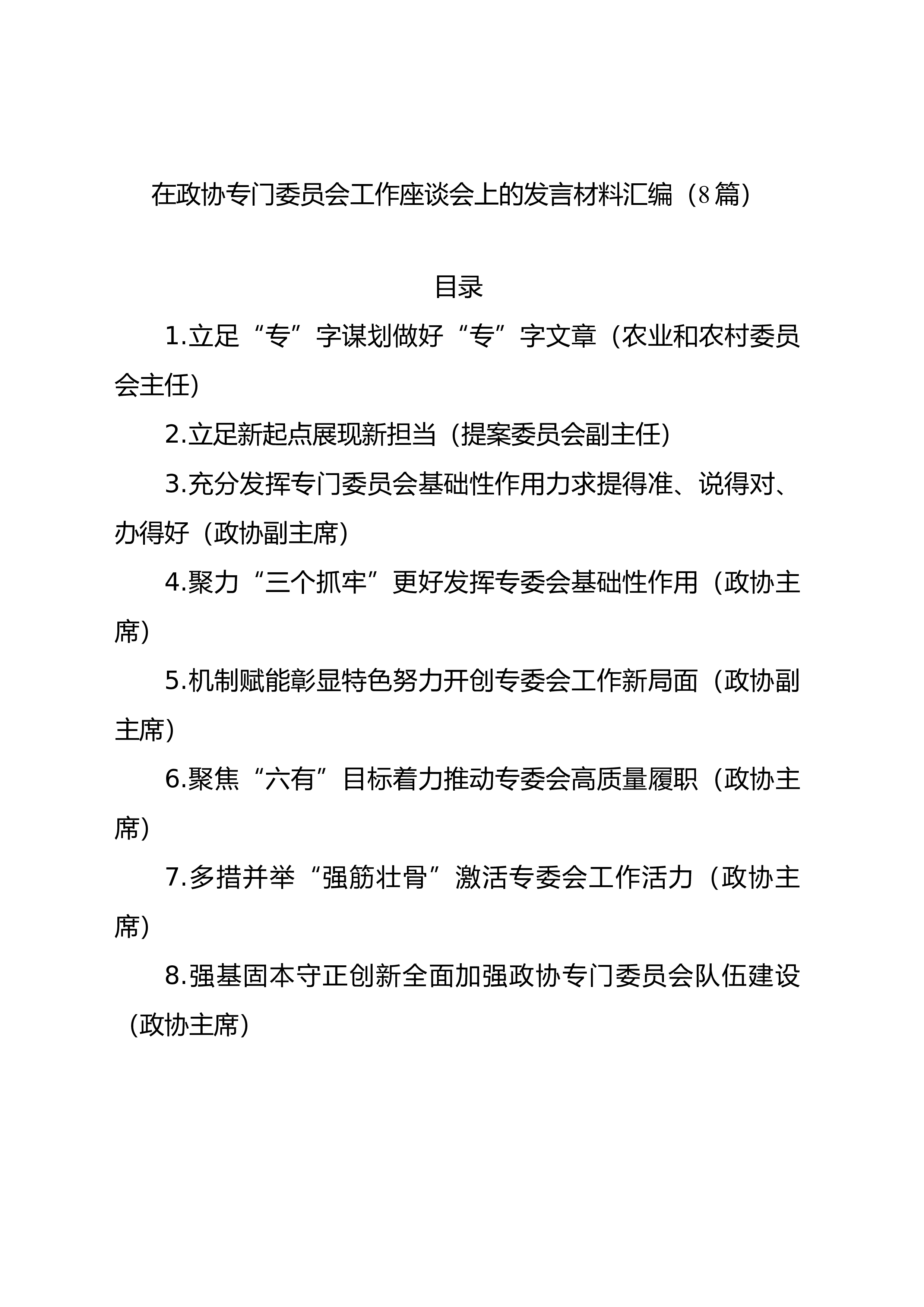 (8篇)目录1.立足“专”字谋划做好“专”字文章(农业和农村委员会主任)2.立足新起点展现新担当(提案委员会副主任)3.充分发挥专门委员会基础性作用力求提得准、说得对、办得好(政协副主席)4.聚力“三个抓牢”更好发挥专委会基础性作用(政协主席)5.机制赋能彰显特色努力开创专委会工作新局面(政协副主席)6.聚焦“六有”目标着力推动专委会高质量履职(政协主席)7.多措并举“强筋壮骨”激活专委会工作活力(政协主席)8.强基固本守正创新全面加强政协专门委员会队伍建设(政协主席)立足“专”字谋划做好“专”字文章(农业和农村委员会主任)注重提高政治站位,把牢“专”...