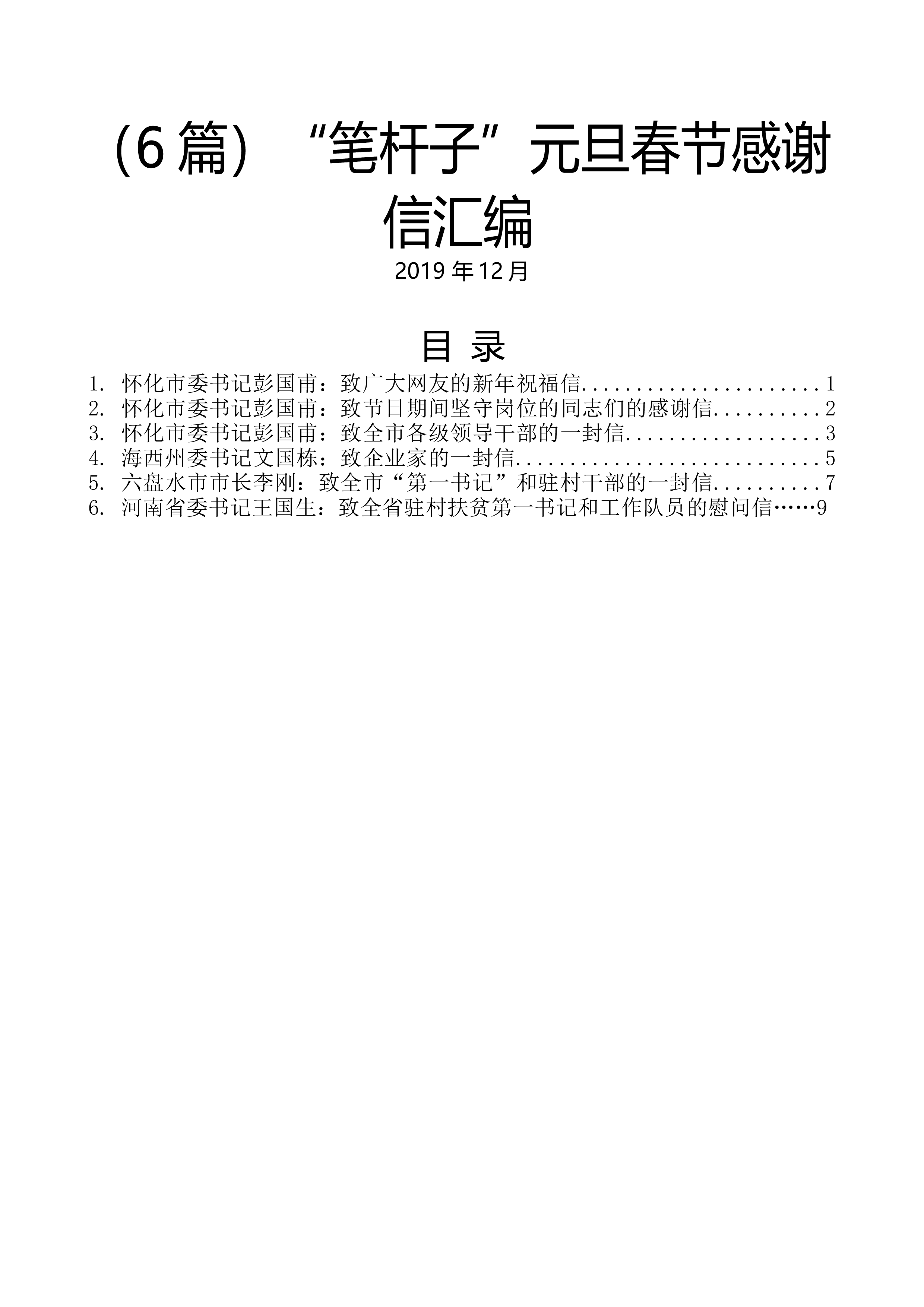 2019年12月目录1.怀化市委书记彭国甫:致广大网友的新年祝福信......................12.怀化市委书记彭国甫:致节日期间坚守岗位的同志们的感谢信..........23.怀化市委书记彭国甫:致全市各级领导干部的一封信..................34.海西州委书记文国栋:致企业家的一封信............................55.六盘水市市长李刚:致全市“第一书记”和驻村干部的一封信..........76.河南省委书记王国生:致全省驻村扶贫第一书记和工作队员的慰问信……9致广大网友的新年祝福信:让我们携手共...