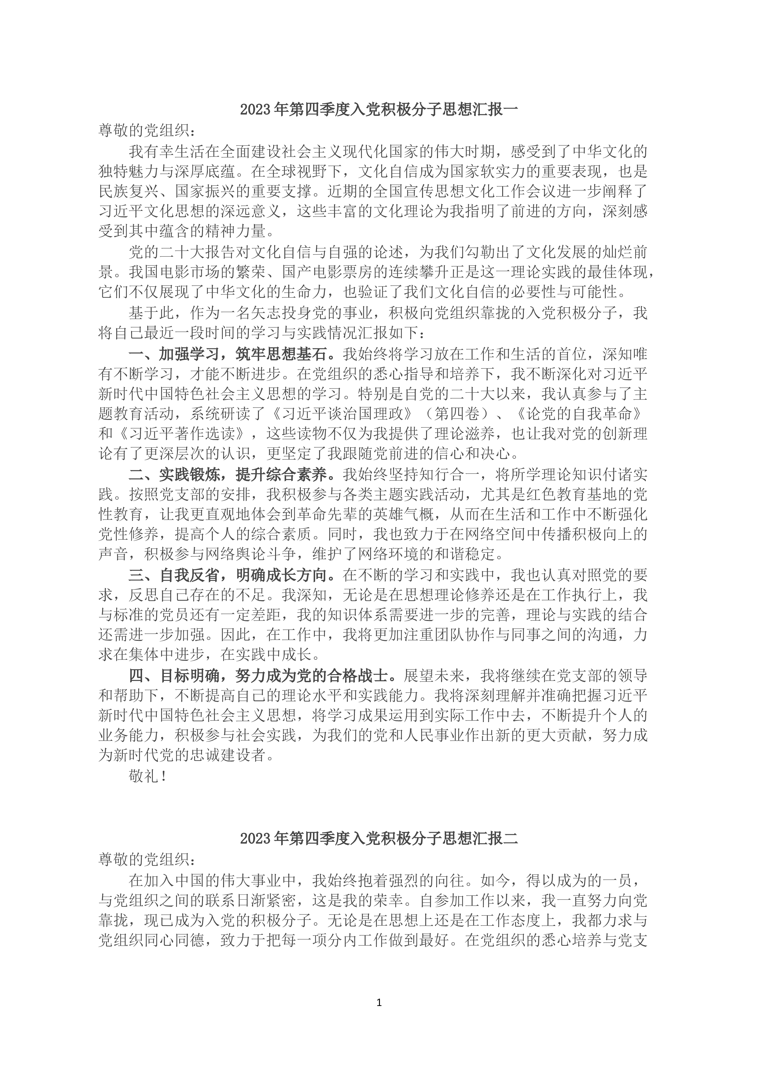 2023年第四季度入党积极分子思想汇报一尊敬的党组织:我有幸生活在全面建设社会主义现代化国家的伟大时期,感受到了中华文化的独特魅力与深厚底蕴。在全球视野下,文化自信成为国家软实力的重要表现,也是民族复兴、国家振兴的重要支撑。近期的全国宣传思想文化工作会议进一步阐释了习近平文化思想的深远意义,这些丰富的文化理论为我指明了前进的方向,深刻感受到其中蕴含的精神力量。党的二十大报告对文化自信与自强的论述,为我们勾勒出了文化发展的灿烂前景。我国电影市场的繁荣、国产电影票房的连续攀升正是这一理论实践的最佳体现,它们不仅展现了中华文化的生命力,也验证了我们文化自信的必要性与可能性。基于此,作为一名矢志投身党...
