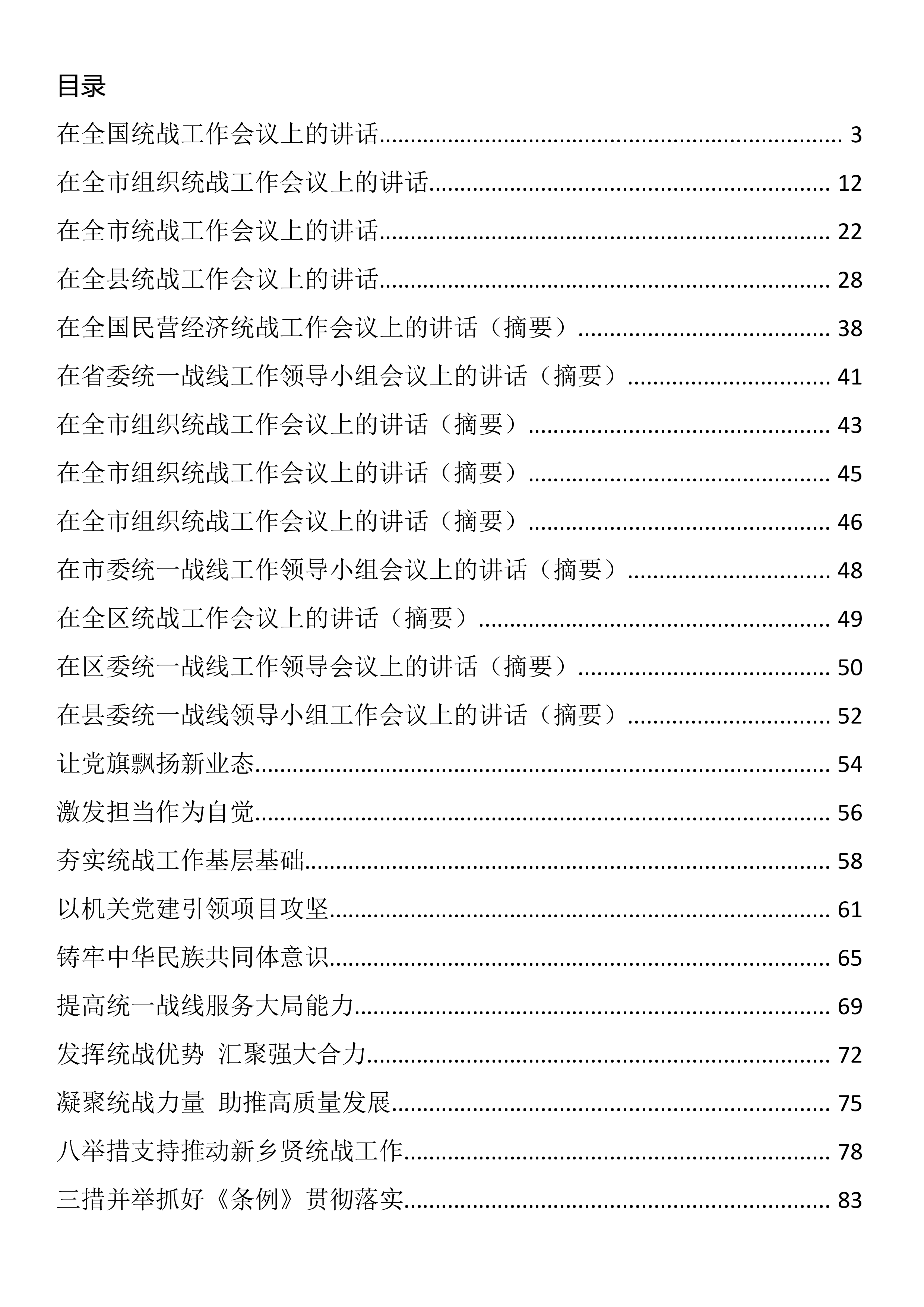 目录在全国统战工作会议上的讲话..........................................................................3在全市组织统战工作会议上的讲话................................................................12在全市统战工作会议上的讲话........................................................................22在全县统战工作会议上的讲话................................