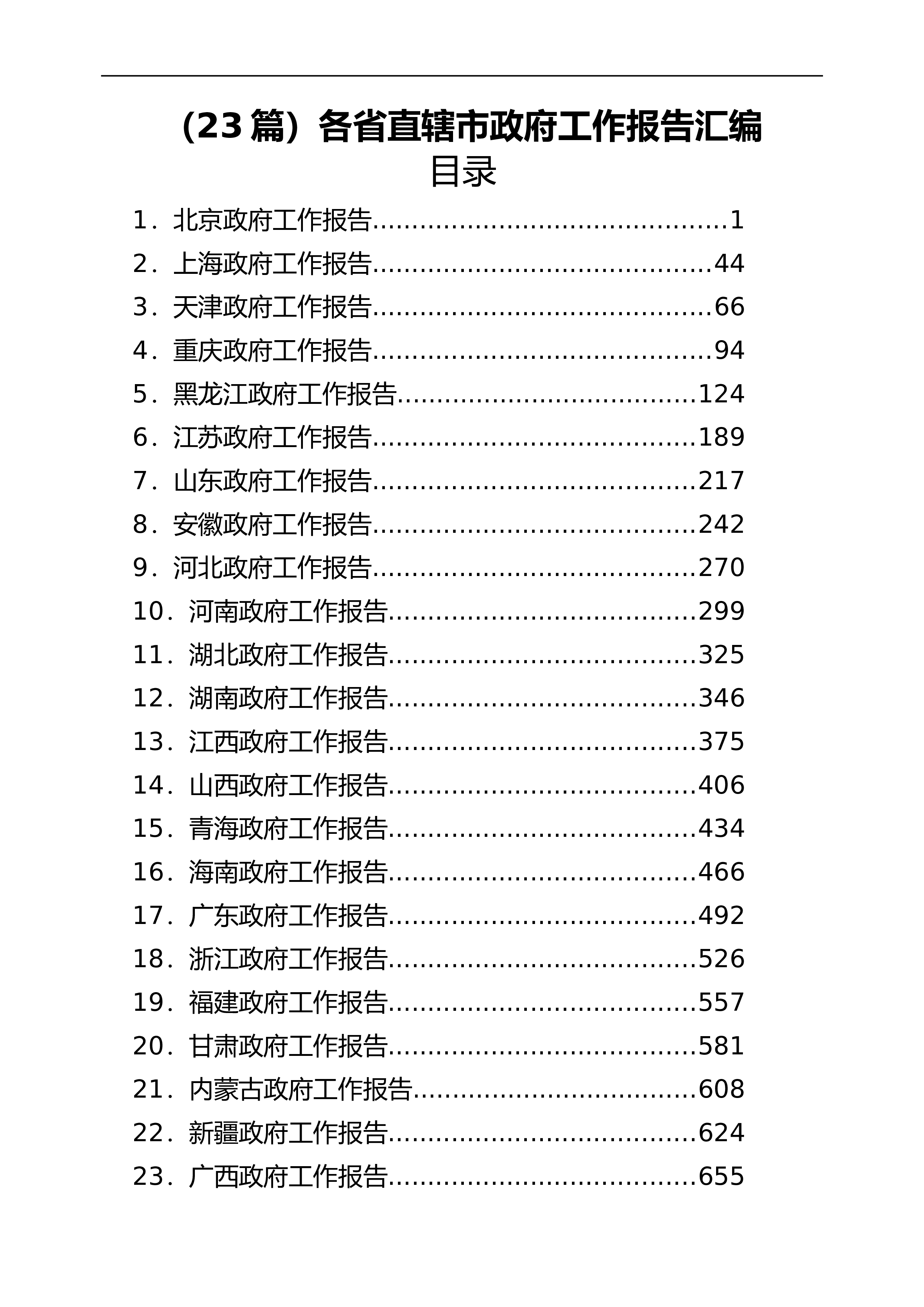 (23篇)各省直辖市政府工作报告汇编目录1.北京政府工作报告.............................................12.上海政府工作报告...........................................443.天津政府工作报告...........................................664.重庆政府工作报告...........................................945.黑龙江政府工作报告......................................1246.江苏政府工...