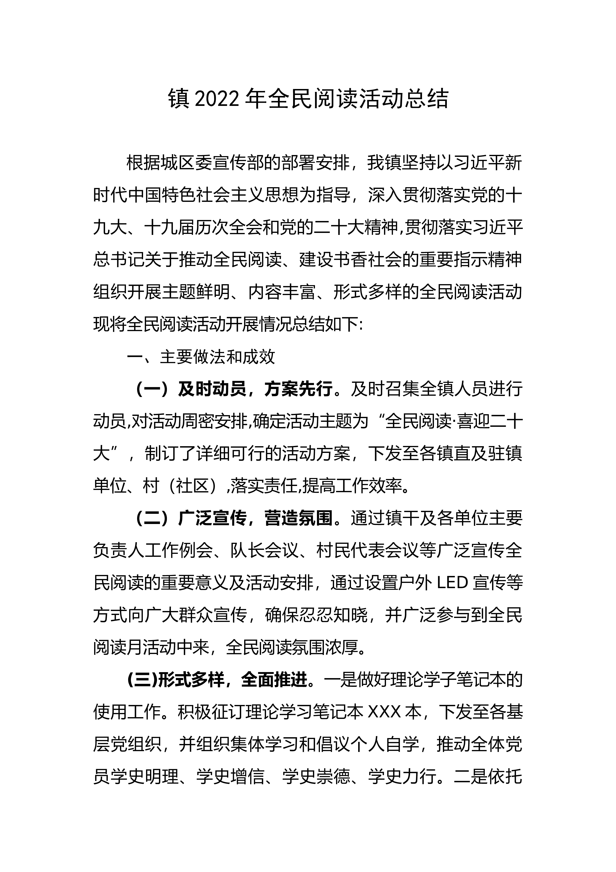 镇2022年全民阅读活动总结根据城区委宣传部的部署安排,我镇坚持以习近平新时代中国特色社会主义思想为指导,深入贯彻落实党的十九大、十九届历次全会和党的二十大精神,贯彻落实习近平总书记关于推动全民阅读、建设书香社会的重要指示精神组织开展主题鲜明、内容丰富、形式多样的全民阅读活动现将全民阅读活动开展情况总结如下:一、主要做法和成效(一)及时动员,方案先行。及时召集全镇人员进行动员,对活动周密安排,确定活动主题为“全民阅读·喜迎二十大”,制订了详细可行的