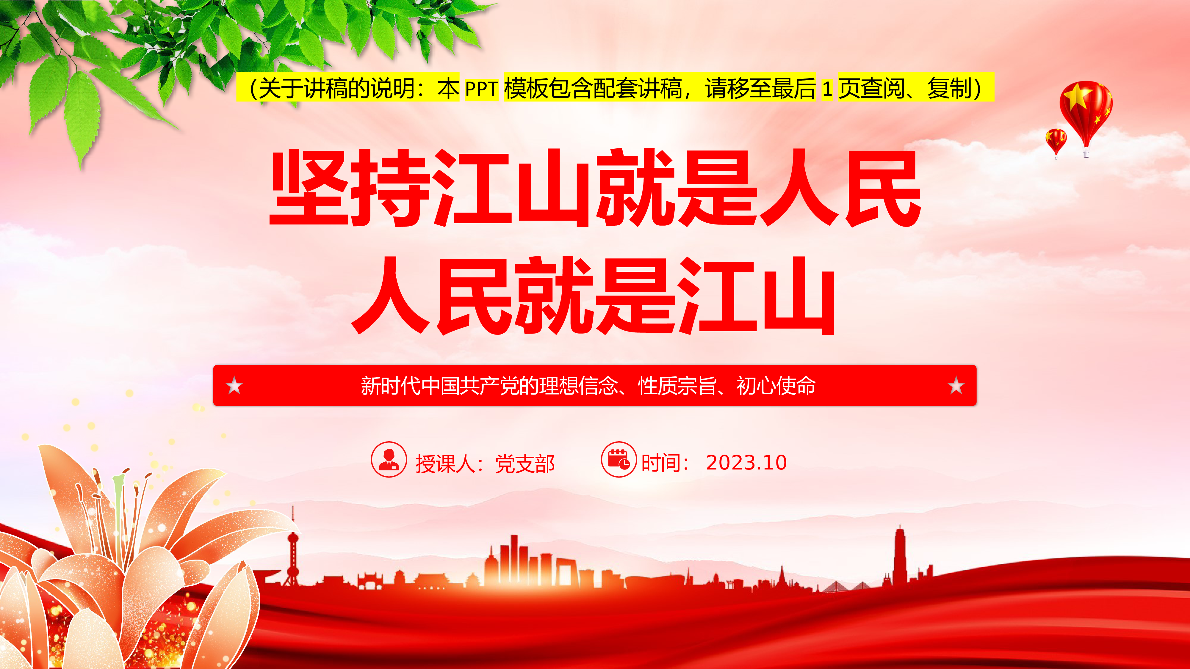 2024微党课2023坚持江山就是人民、人民就是江山ppt模板(带内容)新时代中国共产党的理想信念、性质宗旨、初心使命基层党组织党支部组织党课模板