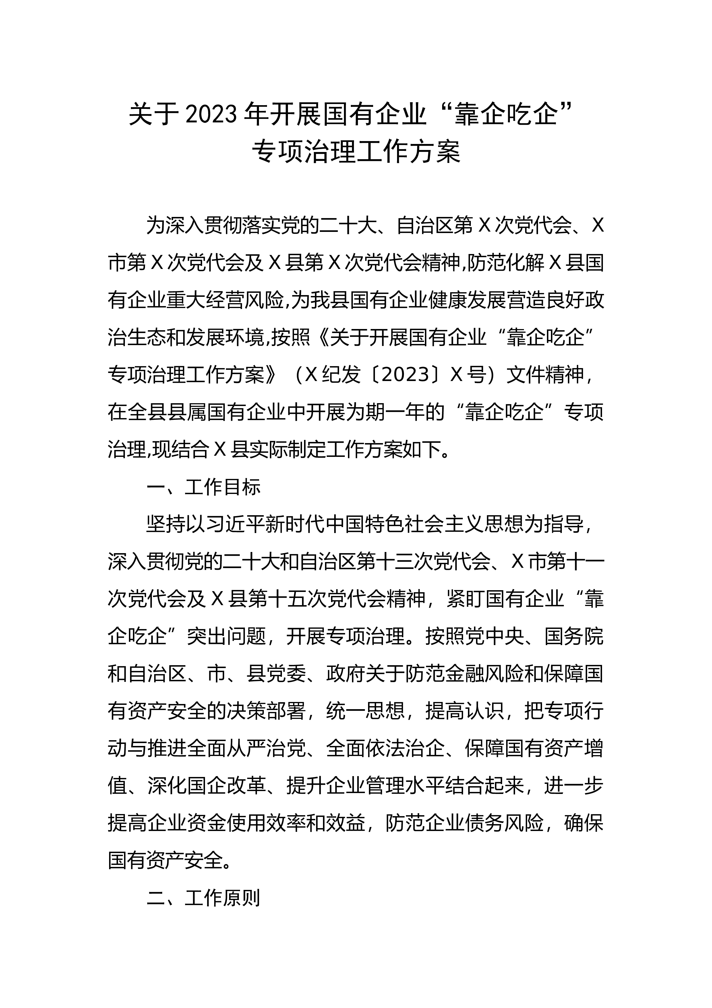 关于2023年开展国有企业“靠企吃企”专项治理工作方案为深入贯彻落实党的二十大、自治区第X次党代会、X市第X次党代会及X县第X次党代会精神,防范化解X县国有企业重大经营风险,为我县国有企业健康发展营造良好政治生态和发展环境,按照《关于开展国有企业“靠企吃企”专项治理工作方案》(X纪发〔2023〕X号)文件精神,在全县县属国有企业中开展为期一年的“靠企吃企”专项治理,现结合X县实际制定工作方案如下。一、工作目标坚持以习近平新时代中国特色社会主义思想为指导,深入贯彻党的二十大和自治区第十三次党代会、X市第十一次党代会及X县第十五次党代会精神,紧盯国有企业“靠企吃企”突出问题,开展专项治理。按照党中...