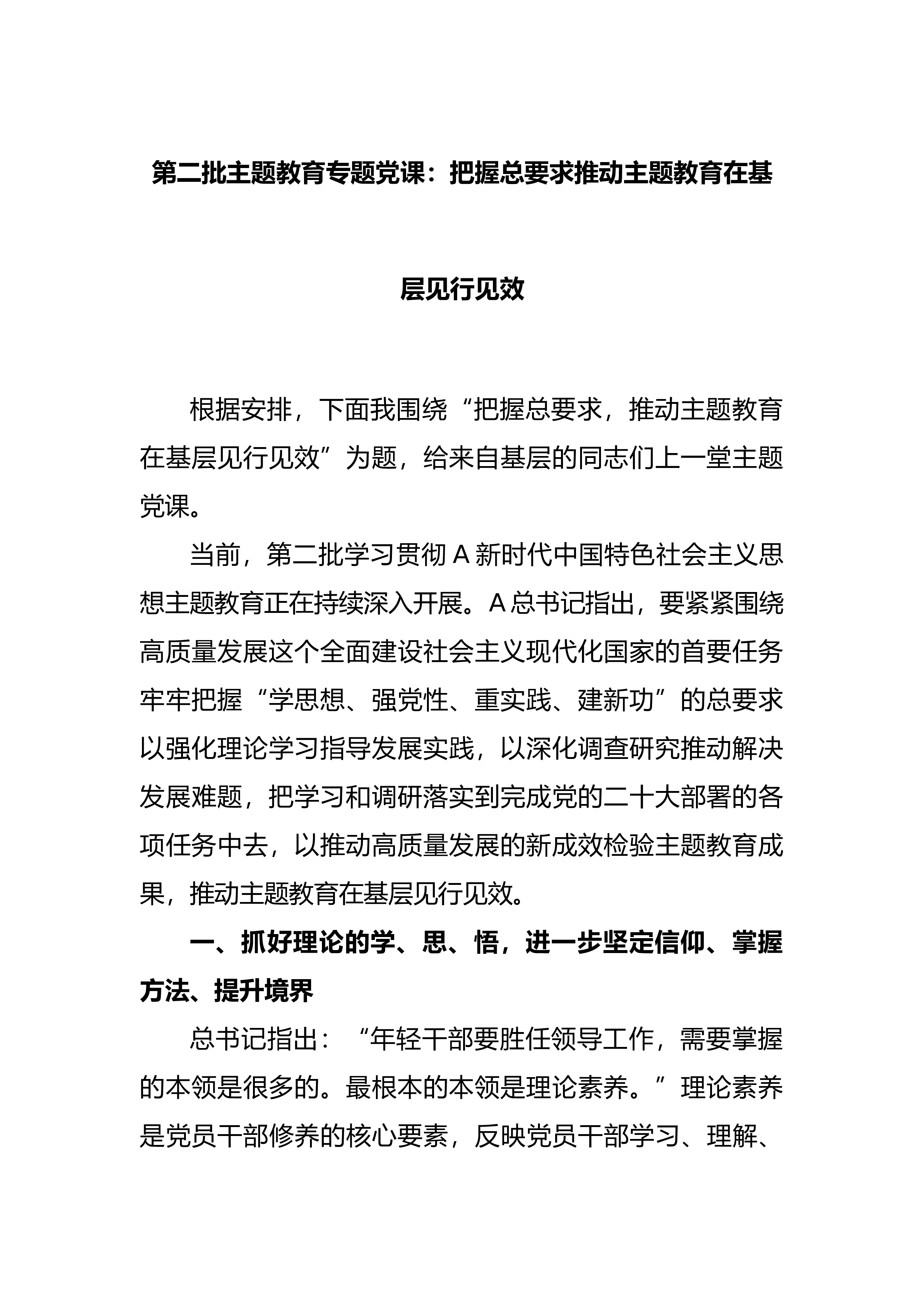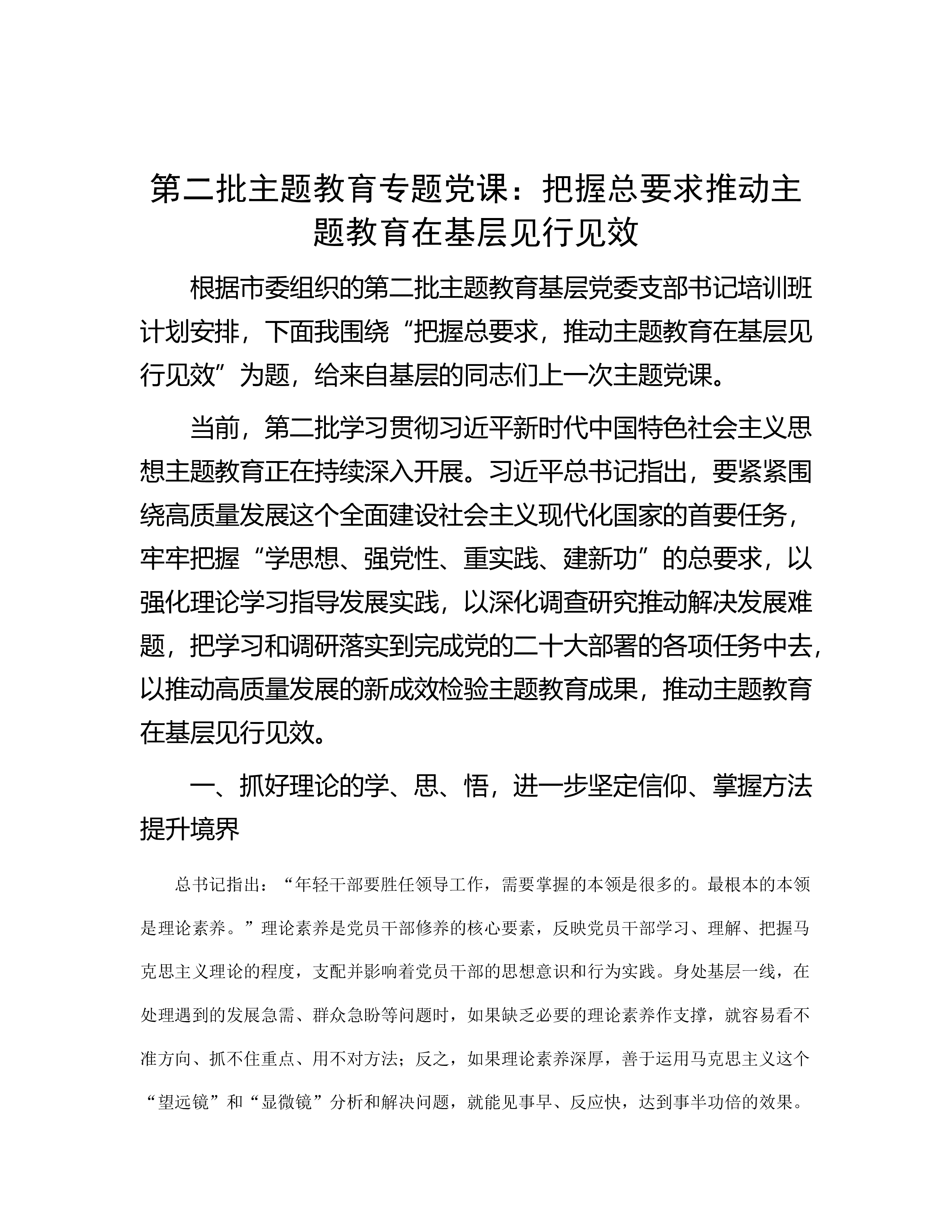 第二批主T教育专题D课:凝心铸魂强D性砥砺前行建新功尊敬的各位同志、亲爱的D员同志们:当前,学习贯彻新时代中国特色社会主义思想主T教育正在如火如荼地进行。今天,我站在这里,以“凝心铸魂强D性,砥砺奋进建新功”为题目,为大家带来一堂精彩的D课。此次D课旨在深入学习贯彻新时代中国特色社会主义思想,进一步加强D性修养,坚定理想信念,以更加坚强的D性开展工作,为D和人民事业作出新的贡献。一、以“学”为先,推动主T教育入脑入心入行。理论创新每前进一步,理论武装就要跟进一步。必须大力弘扬马克思主义学风,不断推进理念创新、手段创新和工作创新,引导D员干部持续在学懂弄通做实上下功夫,自觉做新时代中国特色社会主...