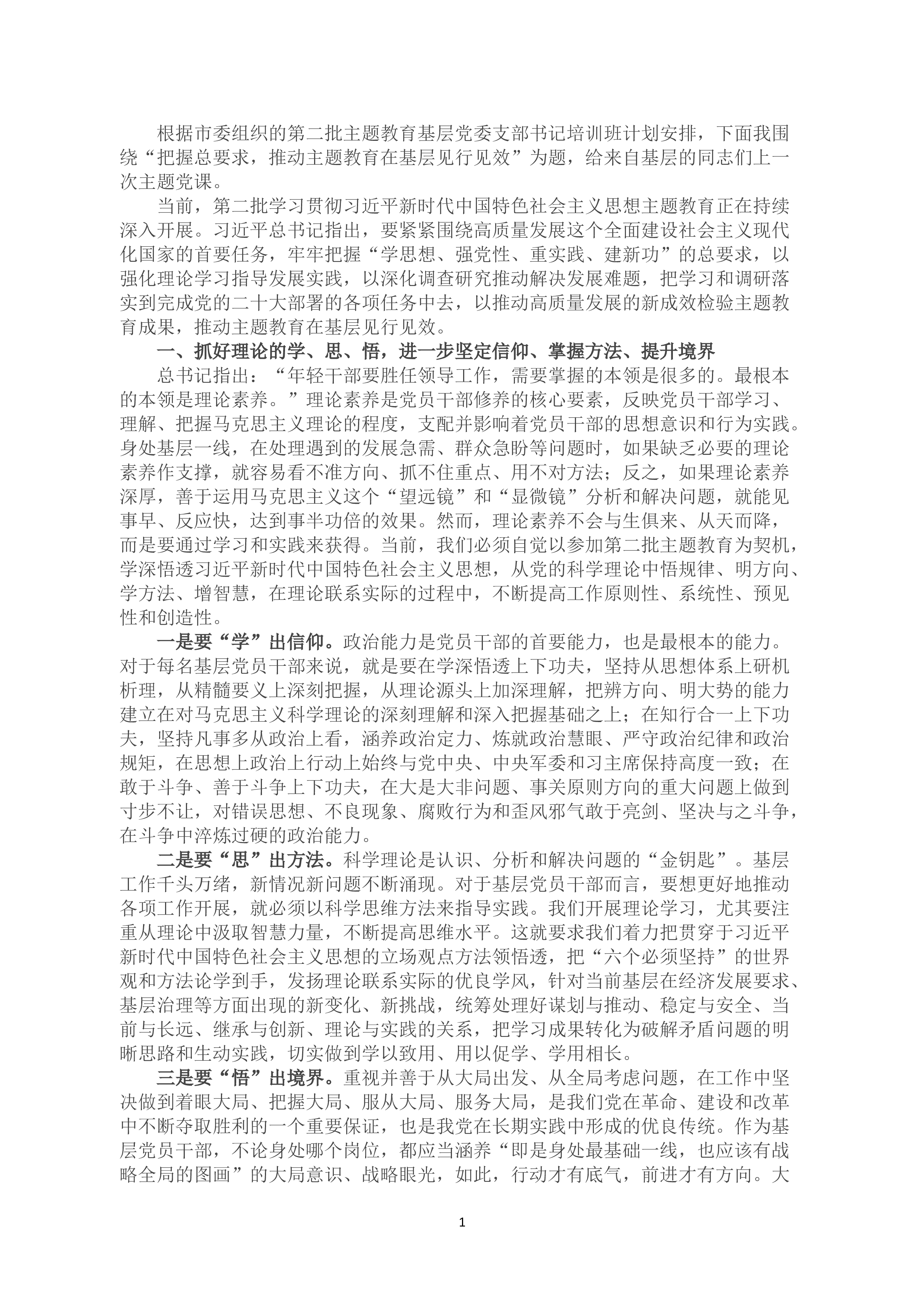 根据市委组织的第二批主T教育基层党委支部书记培训班计划安排,下面我围绕“把握总要求,推动主T教育在基层见行见效”为题,给来自基层的同志们上一次主题党课。当前,第二批学习贯彻习近平新时代中国特色社会主义思想主T教育正在持续深入开展。习近平总书记指出,要紧紧围绕高质量发展这个全面建设社会主义现代化国家的首要任务,牢牢把握“学思想、强党性、重实践、建新功”的总要求,以强化理论学习指导发展实践,以深化调查研究推动解决发展难题,把学习和调研落实到完成党的二十大部署的各项任务中去,以推动高质量发展的新成效检验主T教育成果,推动主T教育在基层见行见效。一、抓好理论的学、思、悟,进一步坚定信仰、掌握方法、提升...