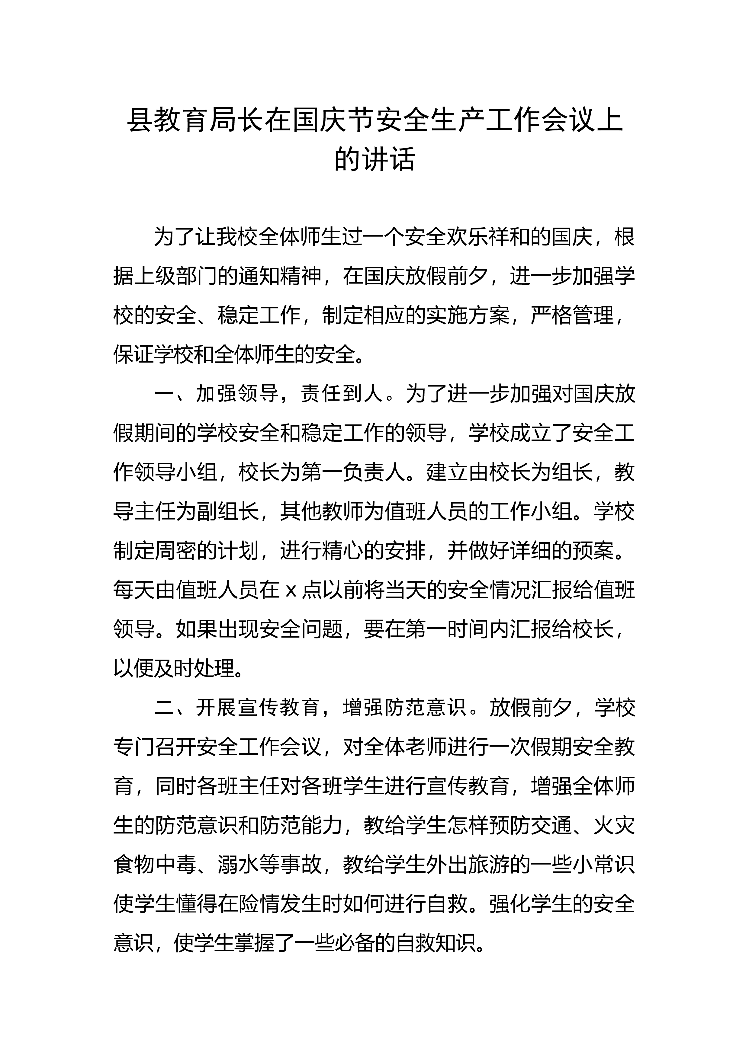 县教育局长在国庆节安全生产工作会议上的讲话为了让我校全体师生过一个安全欢乐祥和的国庆,根据上级部门的通知精神,在国庆放假前夕,进一步加强学校的安全、稳定工作,制定相应的实施方案,严格管理,保证学校和全体师生的安全。一、加强领导,责任到人。为了进一步加强对国庆放假期间的学校安全和稳定工作的领导,学校成立了安全工作领导小组,校长为第一负责人。建立由校长为组长,教导主任为副组长,其他