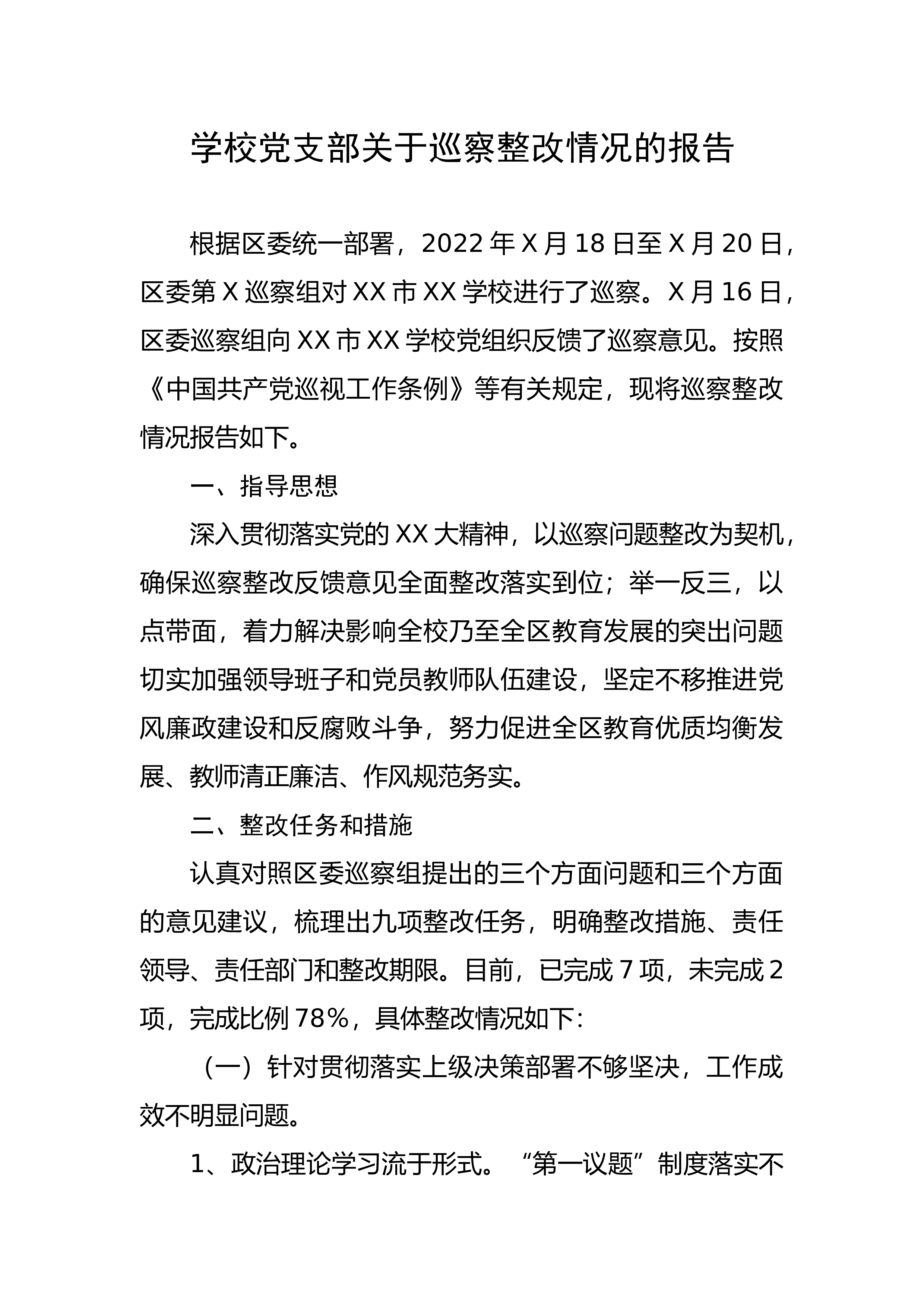 学校党支部关于巡察整改情况的报告根据区委统一部署,2022年X月18日至X月20日,区委第X巡察组对XX市XX学校进行了巡察。X月16日,区委巡察组向XX市XX学校党组织反馈了巡察意见。按照《中国共产党巡视工作条例》等有关规定,现将巡察整改情况报告如下。一、指导思想深入贯彻落实党的XX大精神,以巡察问题整改为契机,确保巡察整改反馈意见全面整改落实到位;举一反三,以点带面,着力解决影响全校乃至全区教育发展的突出问题切实加强领导班子和党员