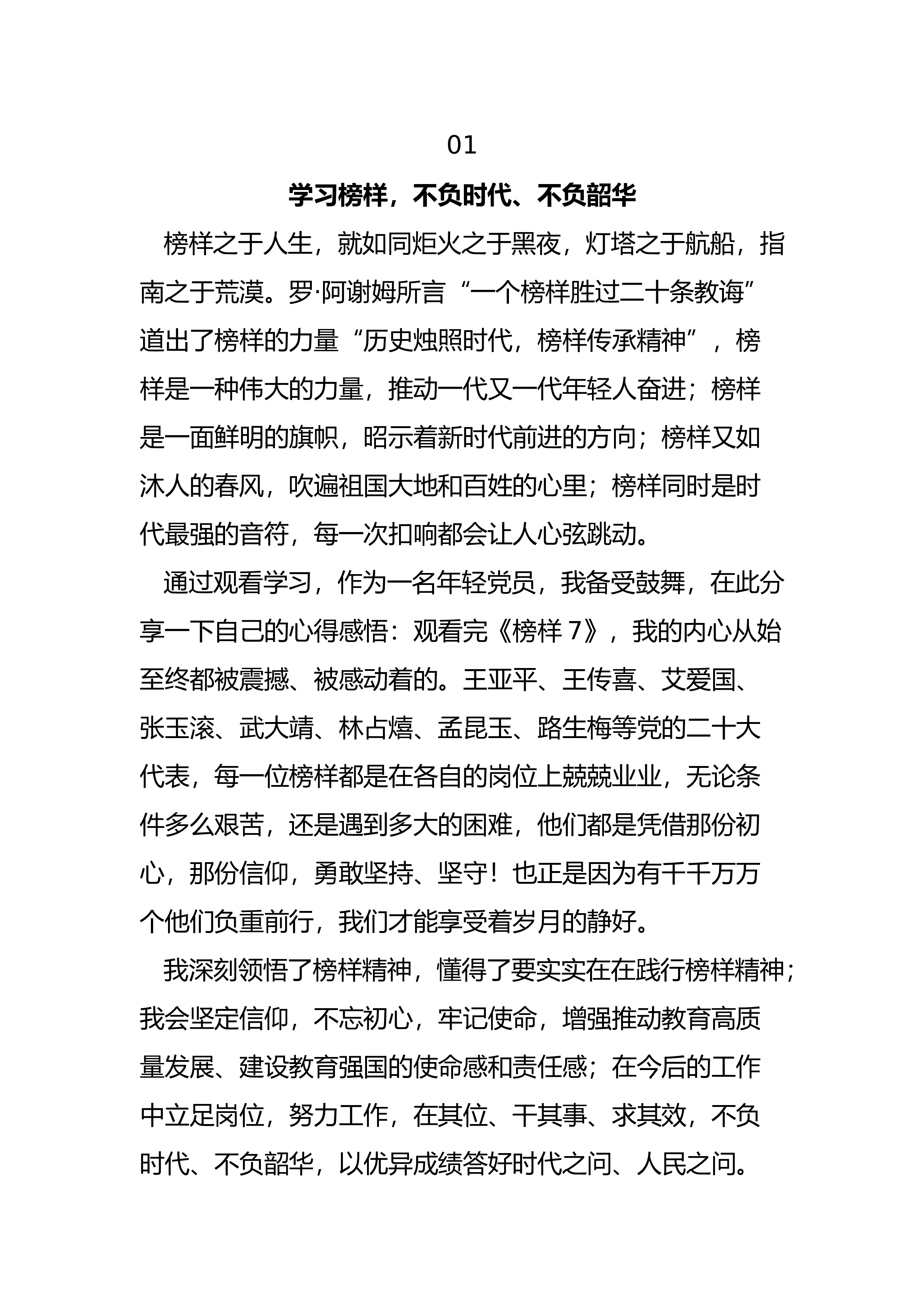 01学习榜样,不负时代、不负韶华 榜样之于人生,就如同炬火之于黑夜,灯塔之于航船,指南之于荒漠。罗·阿谢姆所言“一个榜样胜过二十条教诲”道出了榜样的力量“历史烛照时代,榜样传承精神”,榜样是一种伟大的力量,推动一代又一代年轻人奋进;榜样是一面鲜明的旗帜,昭示着新时代前进的方向;榜样又如沐人的春风,吹遍祖国大地和百姓的心里;榜样同时是时代最强的音符,每一次扣响都会让人心弦跳动。 通过观看学习,作为一名年轻党员,我备受鼓舞,在此分享一下自己的心得感悟:观看完《榜样7》,我的内心从始至终都被震撼、被感动着的。王亚平、王传喜、艾爱国、张玉滚、武大靖、林占熺、孟昆玉、路生梅等党的二十大代表,每一位榜...