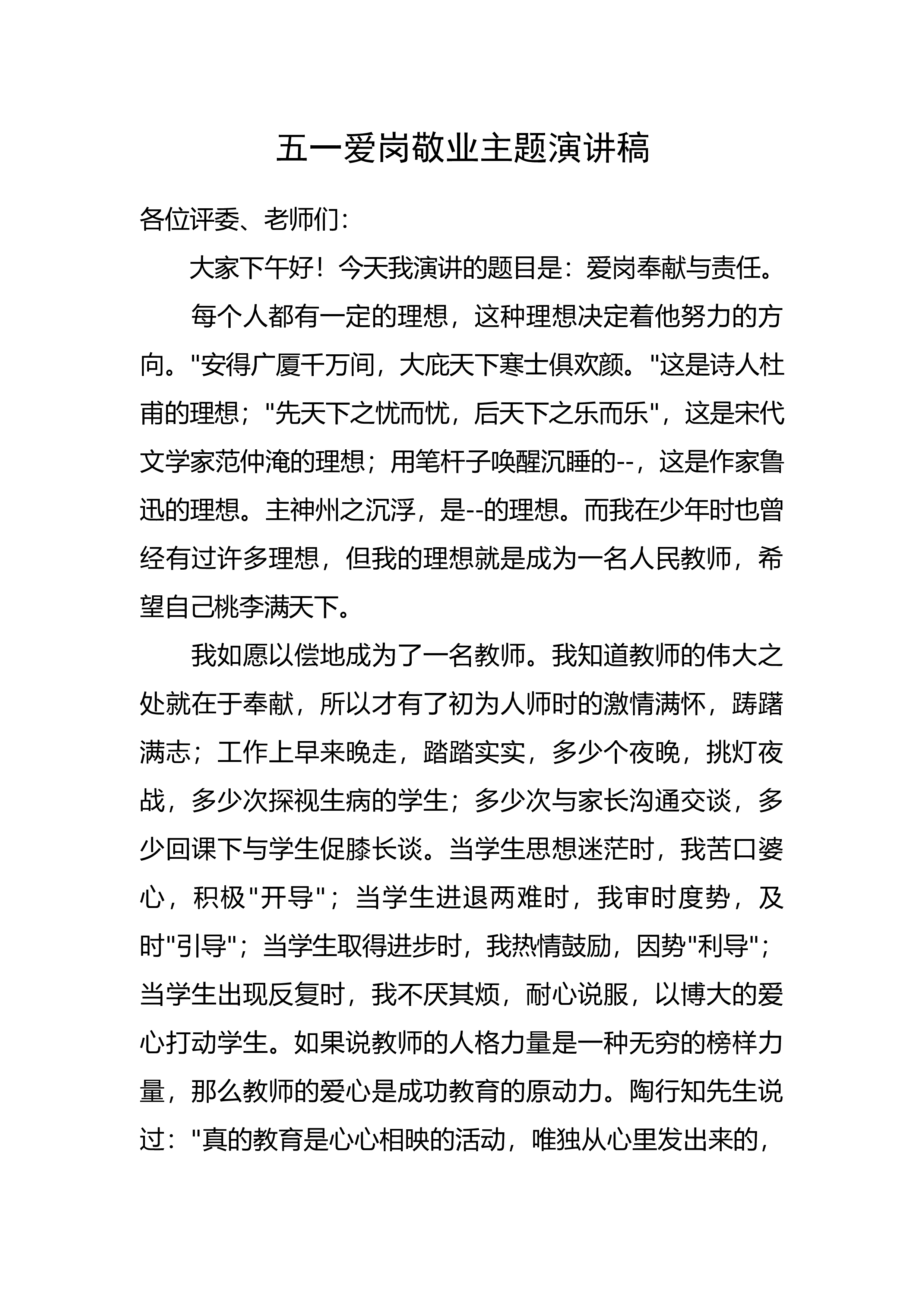 五一爱岗敬业主题演讲稿 各位评委、老师们: 大家下午好!今天我演讲的题目是:爱岗奉献与责任。 每个人都有一定的理想,这种理想决定着他努力的方向。"安得广厦千万间,大庇天下寒士俱欢颜。"这是诗人杜甫的理想;"先天下之忧而忧,后天下之乐而乐",这是宋代文学家范仲淹的理想;用笔杆子唤醒沉睡的--,这是作家鲁迅的理想。主神州之沉浮,是--的理想。而我在少年时也曾经有过许多理想,但我的理想就是成为一名人民