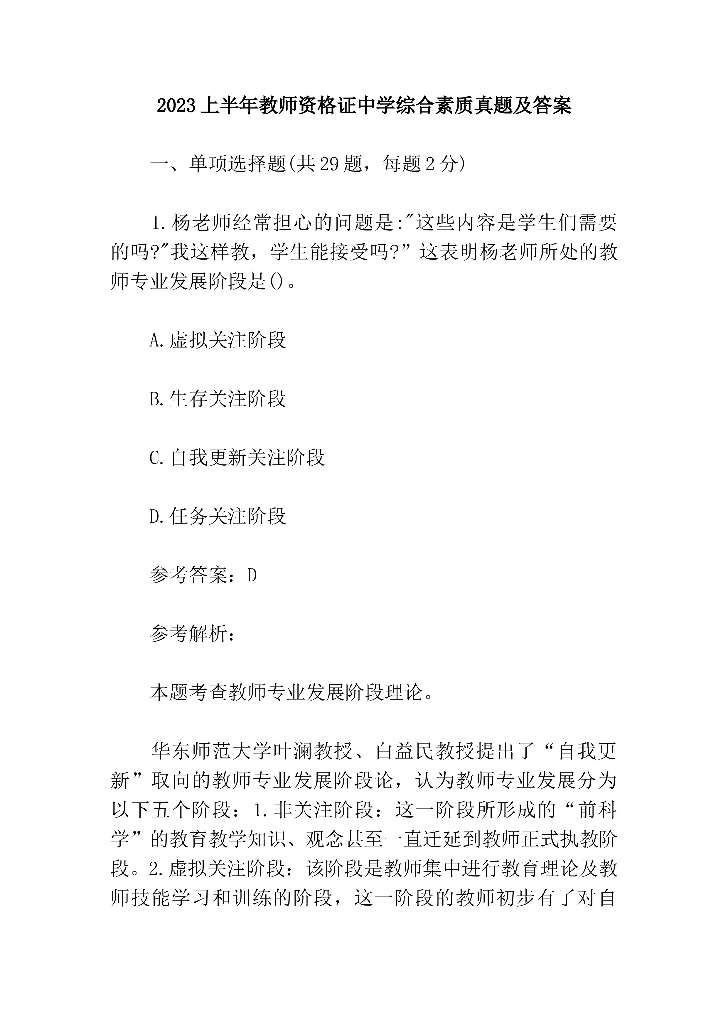 资格证中学综合素质真题及答案 一、单项选择题(共29题,每题2分) 1.杨老师经常担心的问题是:"这些内容是学生们需要的吗?"我这样教,学生能接受吗?”这表明杨老师所处的