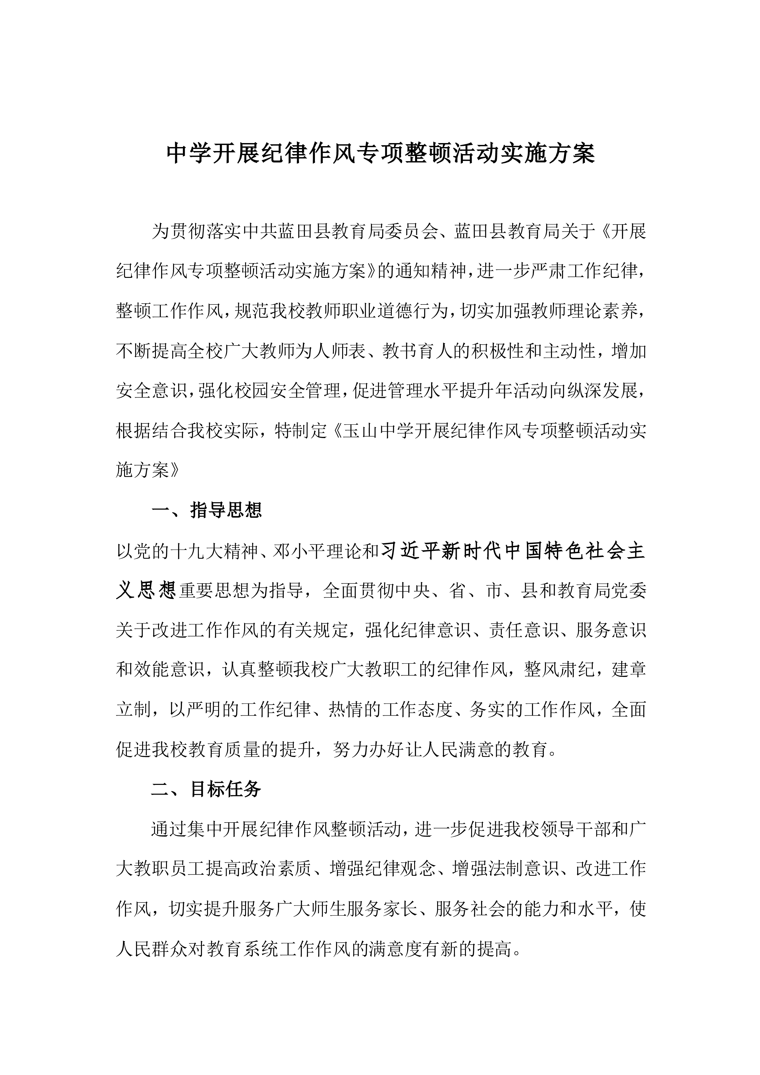 中学开展纪律作风专项整顿活动实施方案为贯彻落实中共蓝田县教育局委员会、蓝田县教育局关于《开展纪律作风专项整顿活动实施方案》的通知精神进一步严肃工作纪律整顿工作作风规范我校