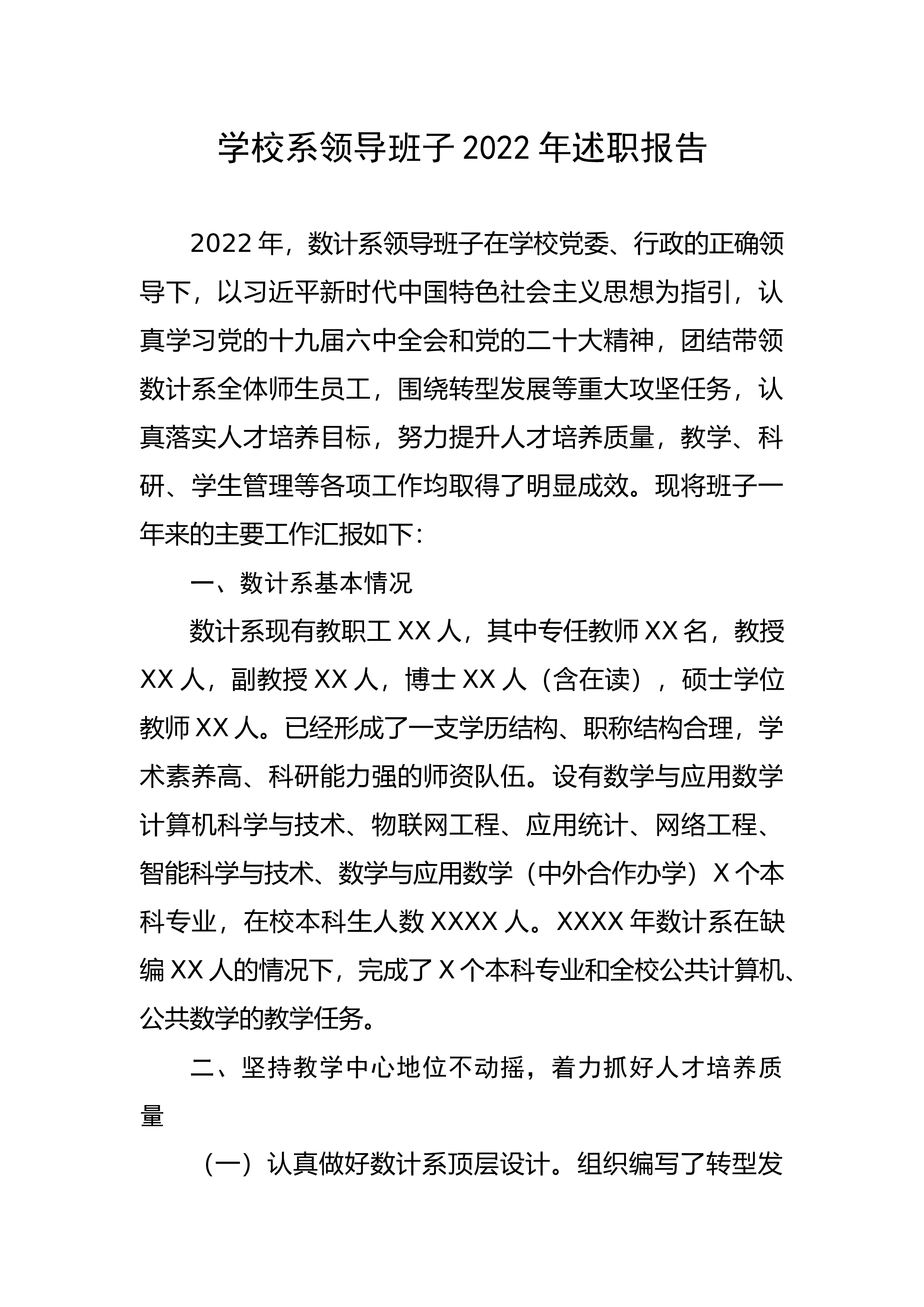 学校系领导班子2022年述职报告2022年,数计系领导班子在学校党委、行政的正确领导下,以习近平新时代中国特色社会主义思想为指引,认真学习党的十九届六中全会和党的二十大精神,团结带领数计系全体师生员工,围绕转型发展等重大攻坚任务,认真落实人才培养目标,努力提升人才培养质量,教学、科研、学生管理等各项工作均取得了明显成效。现将班子一年来的主要工作汇报如下:一、数计系基本情况数计系现有教职工XX人,其中专任