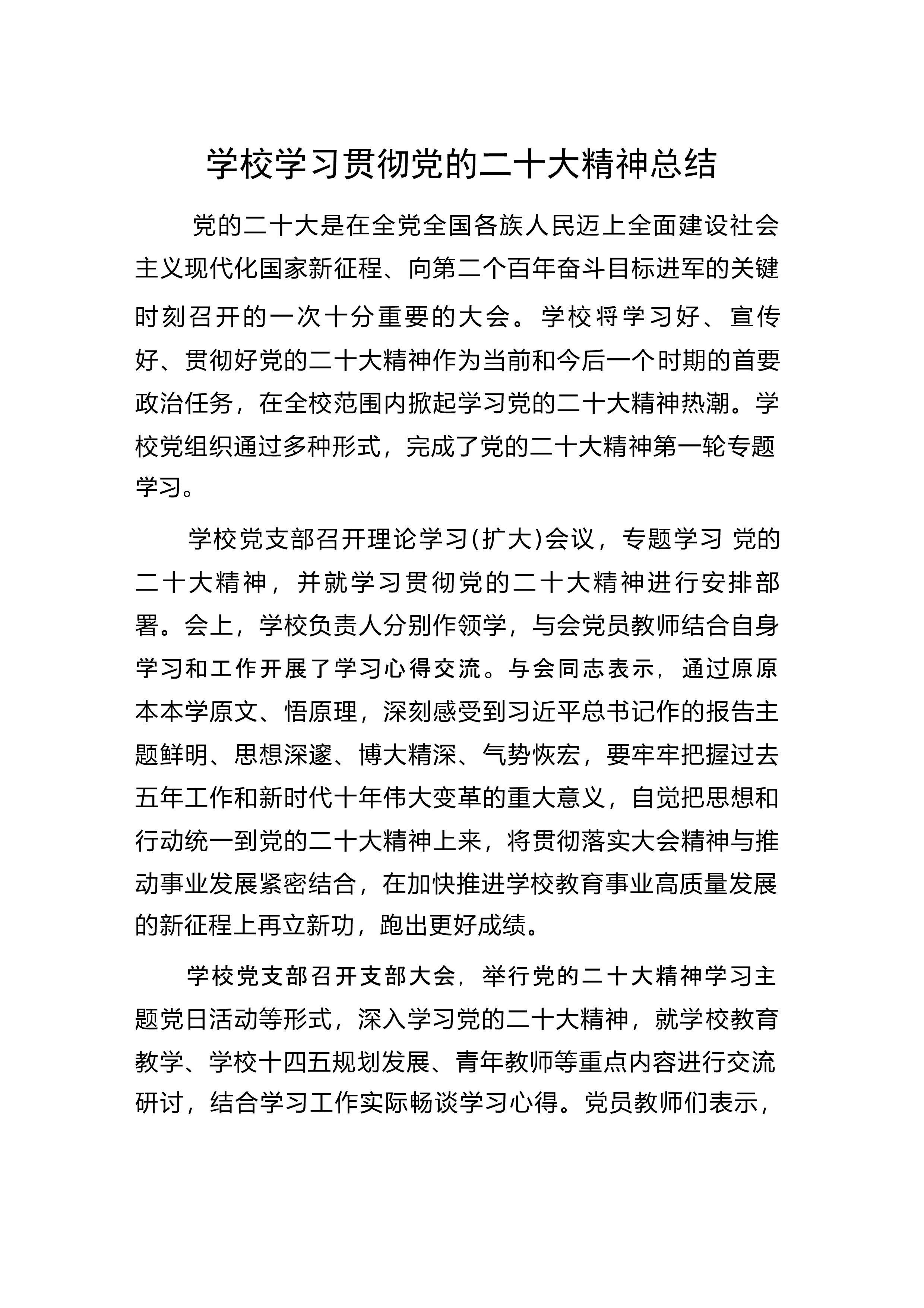 学校学习贯彻党的二十大精神总结党的二十大是在全党全国各族人民迈上全面建设社会主义现代化国家新征程、向第二个百年奋斗目标进军的关键时刻召开的一次十分重要的大会。学校将学习好、宣传好、贯彻好党的二十大精神作为当前和今后一个时期的首要政治任务,在全校范围内掀起学习党的二十大精神热潮。学校党组织通过多种形式,完成了党的二十大精神第一轮专题学。习学校党支部召开理论学习(扩大)会议,专题学习党的二十大精神,并就学习贯彻党的二十大精神进行安排部署。会上,学校负责人分别作领学,与会党员