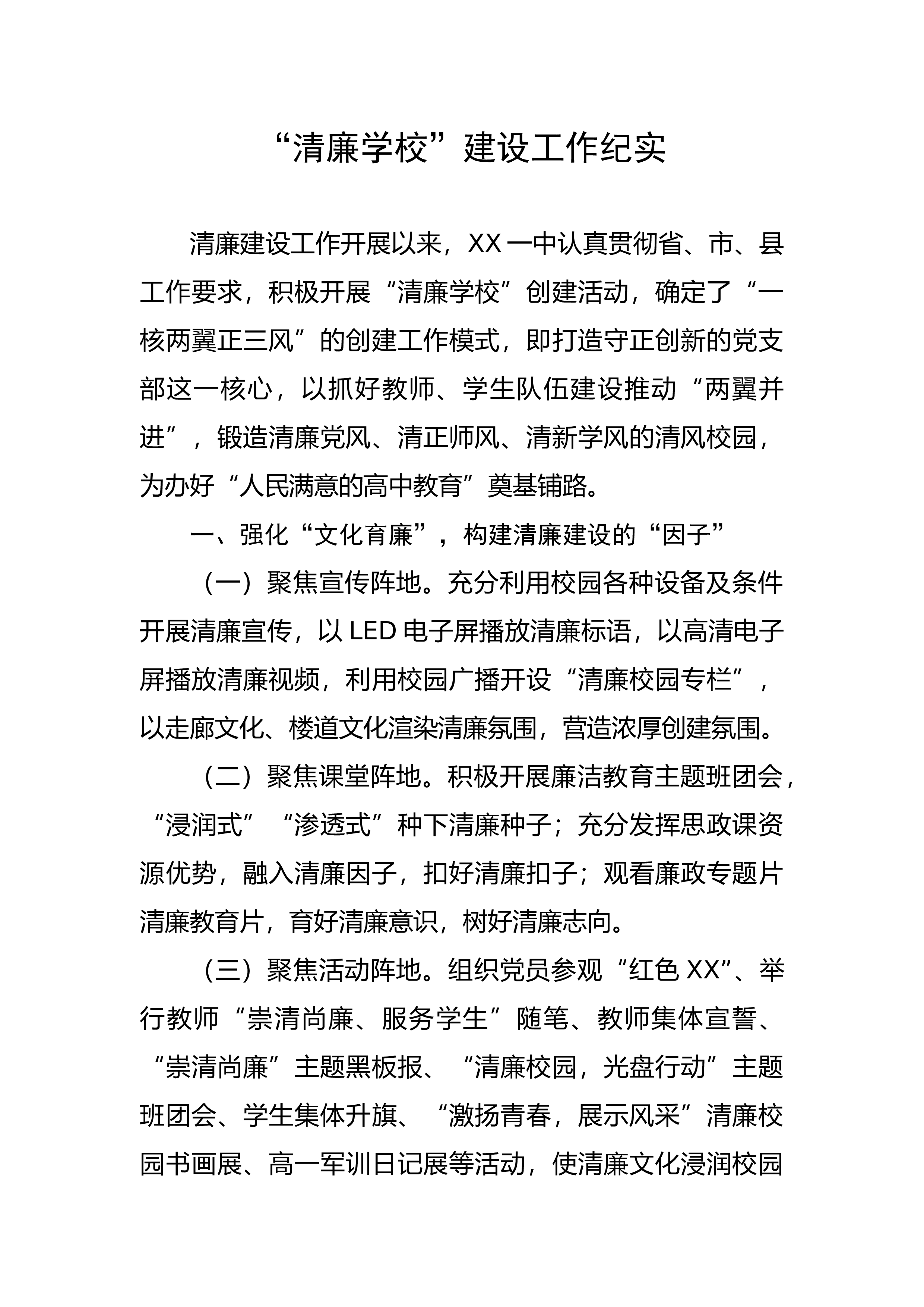 “清廉学校”建设工作纪实清廉建设工作开展以来,XX一中认真贯彻省、市、县工作要求,积极开展“清廉学校”创建活动,确定了“一核两翼正三风”的创建工作模式,即打造守正创新的党支部这一核心,以抓好