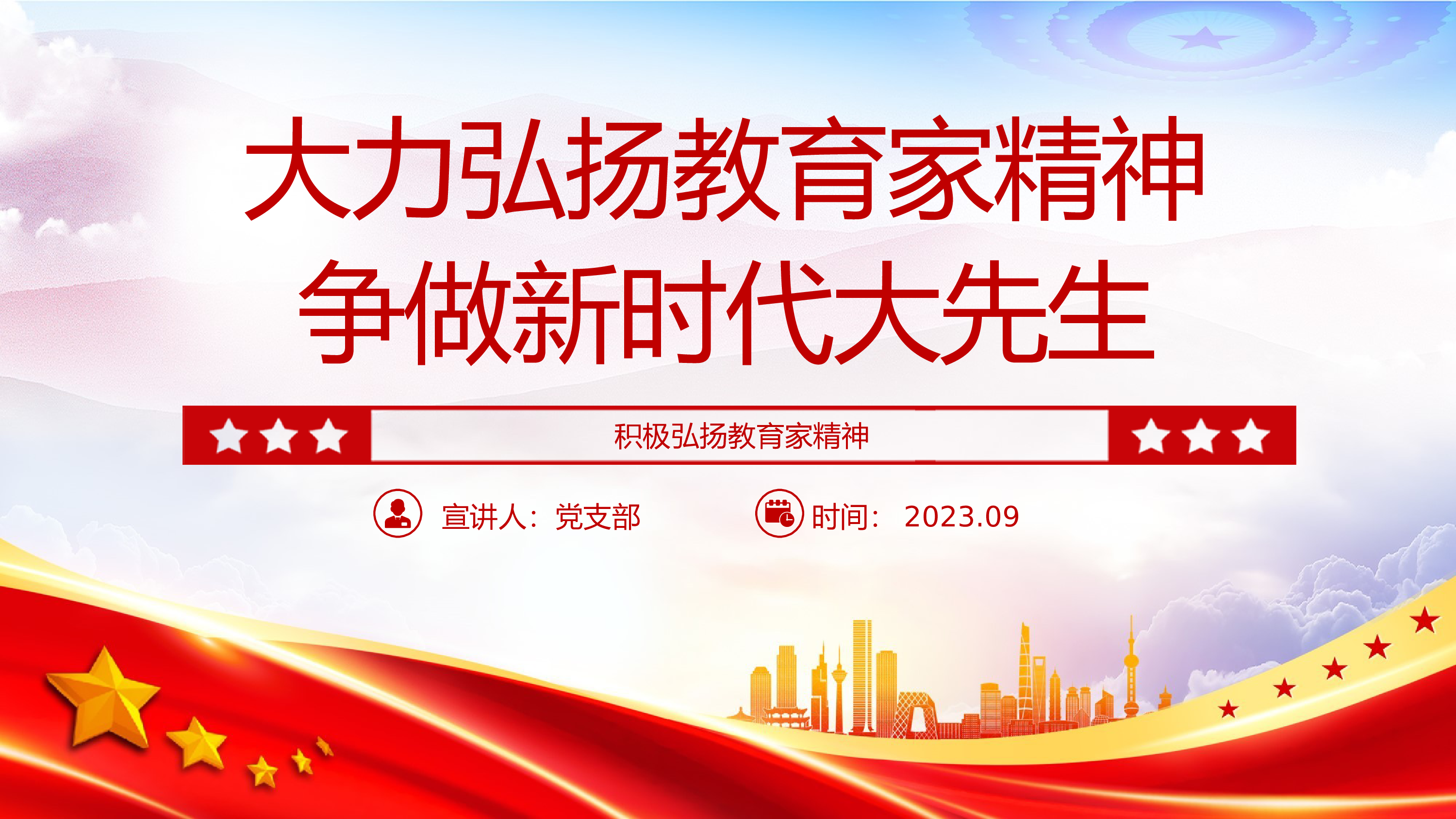 积极弘扬教育家精神宣讲人:党支部时间:2023.09大力弘扬教育家精神争做新时代大先生近日,习近平总书记致信全国优秀