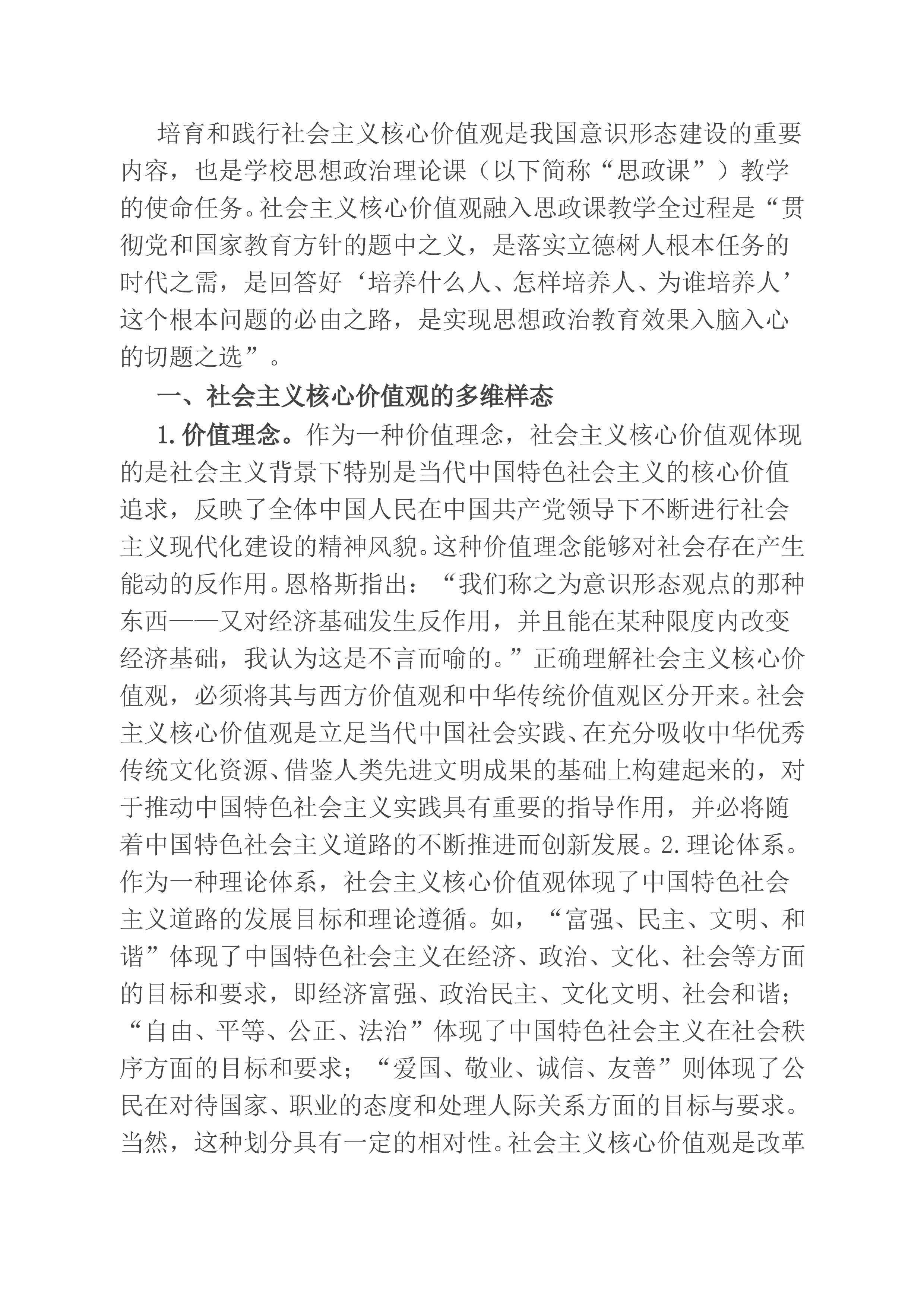 培育和践行社会主义核心价值观是我国意识形态建设的重要内容,也是学校思想政治理论课(以下简称“思政课”)教学的使命任务。社会主义核心价值观融入思政课教学全过程是“贯彻党和国家教育方针的题中之义,是落实立德树人根本任务的时代之需,是回答好‘培养什么人、怎样培养人、为谁培养人’这个根本问题的必由之路,是实现思想政治教育效果入脑入心的切题之选”。一、社会主义核心价值观的多维样态1.价值理念。作为一种价值理念,社会主义核心价值观体现的是社会主义背景下特别是当代中国特色社会主义的核心价值追求,反映了全体中国人民在中国共产党领导下不断进行社会主义现代化建设的精神风貌。这种价值理念能够对社会存在产生能动的反作...