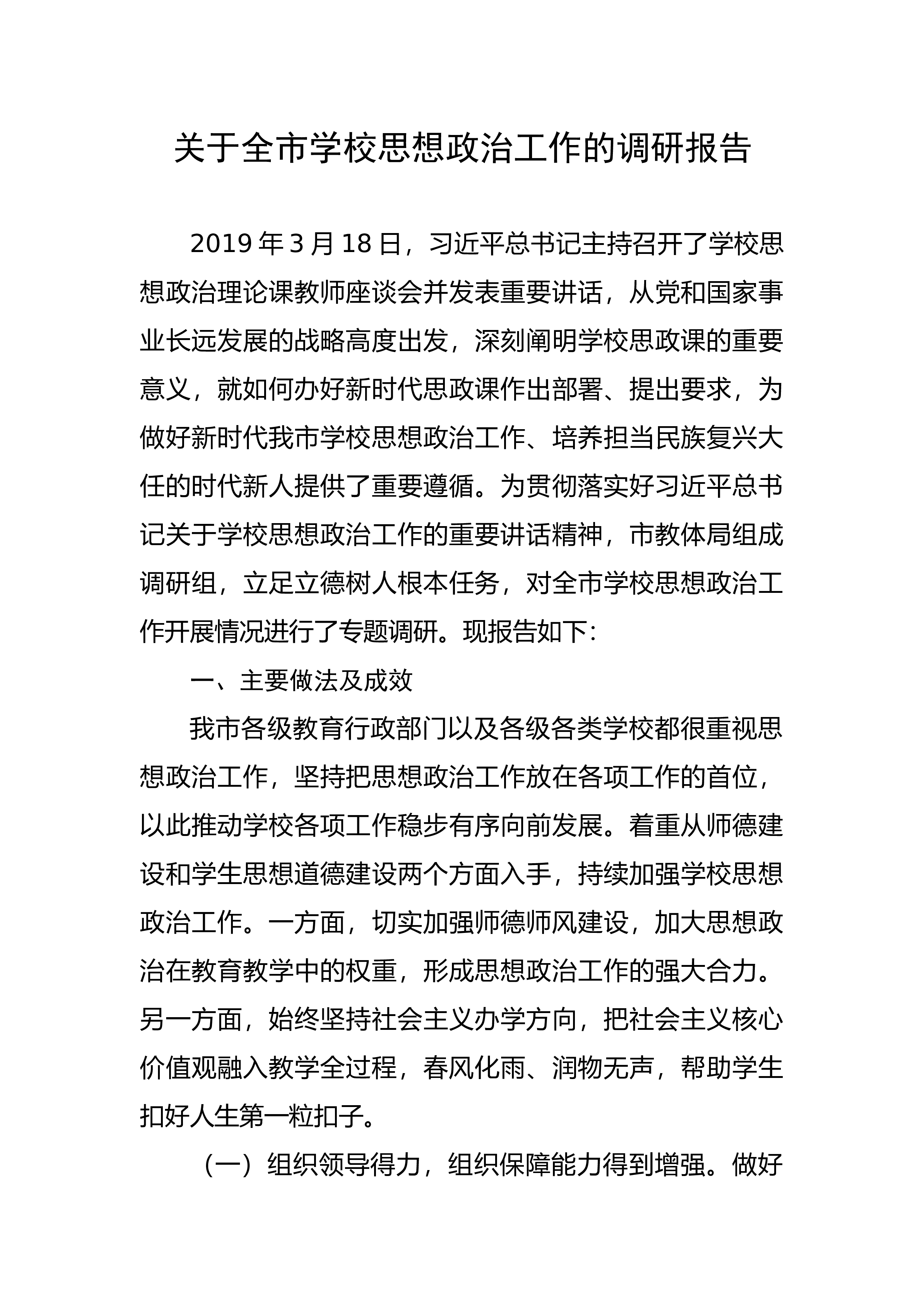 关于全市学校思想政治工作的调研报告2019年3月18日,习近平总书记主持召开了学校思想政治理论课