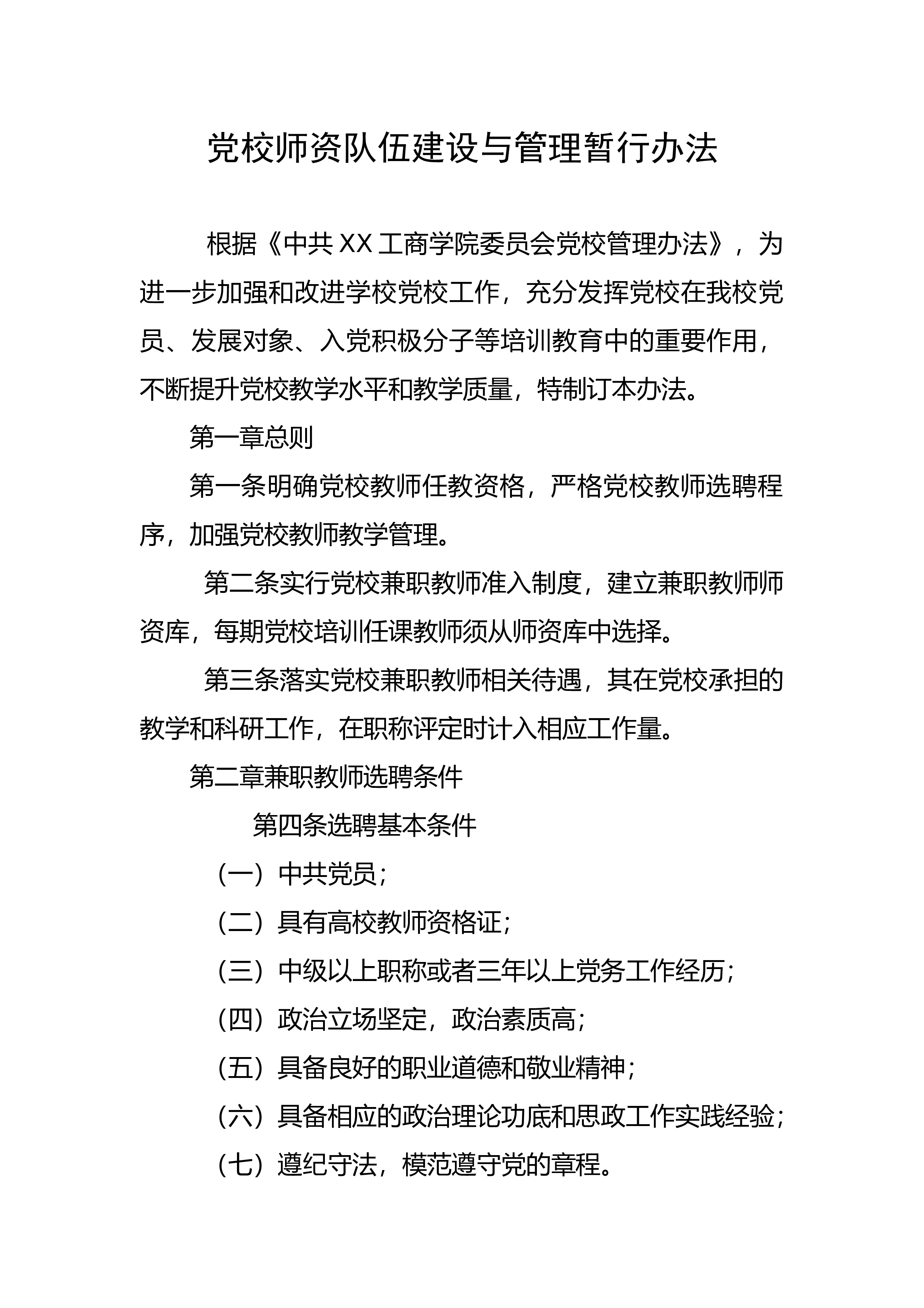 党校师资队伍建设与管理暂行办法 根据《中共XX工商学院委员会党校管理办法》,为进一步加强和改进学校党校工作,充分发挥党校在我校党员、发展对象、入党积极分子等培训教育中的重要作用,不断提升党校教学水平和教学质量,特制订本办法。第一章总则第一条明确党校