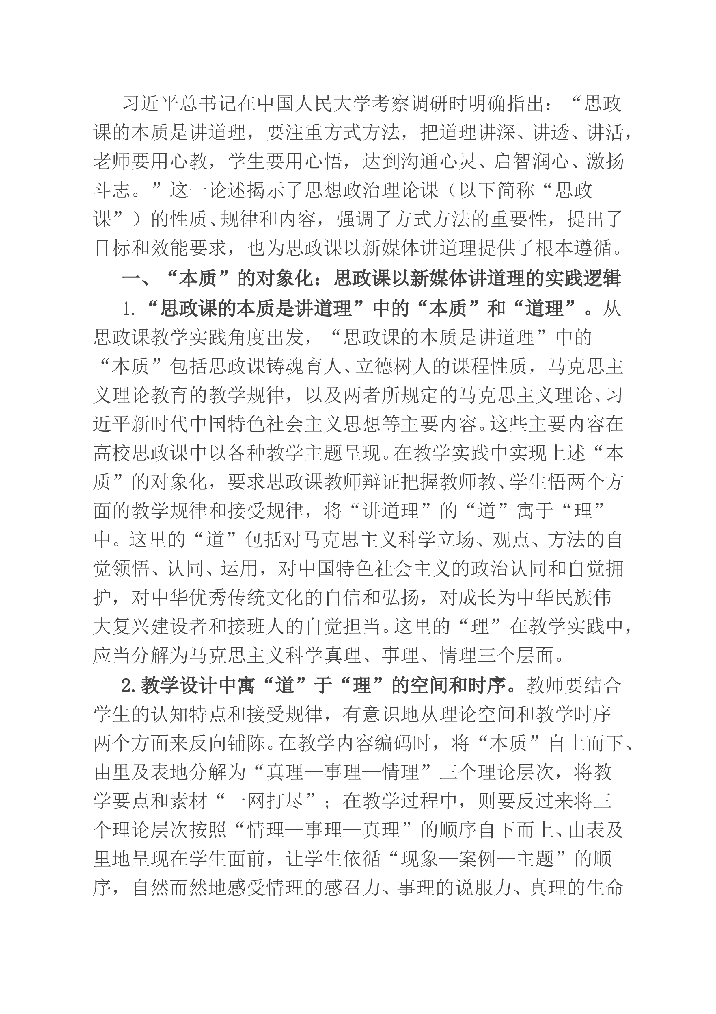 习近平总书记在中国人民大学考察调研时明确指出:“思政课的本质是讲道理,要注重方式方法,把道理讲深、讲透、讲活,老师要用心教,学生要用心悟,达到沟通心灵、启智润心、激扬斗志。”这一论述揭示了思想政治理论课(以下简称“思政课”)的性质、规律和内容,强调了方式方法的重要性,提出了目标和效能要求,也为思政课以新媒体讲道理提供了根本遵循。一、“本质”的对象化:思政课以新媒体讲道理的实践逻辑1.“思政课的本质是讲道理”中的“本质”和“道理”。从思政课教学实践角度出发,“思政课的本质是讲道理”中的“本质”包括思政课铸魂育人、立德树人的课程性质,马克思主义理论教育的教学规律,以及两者所规定的马克思主义理论、习...