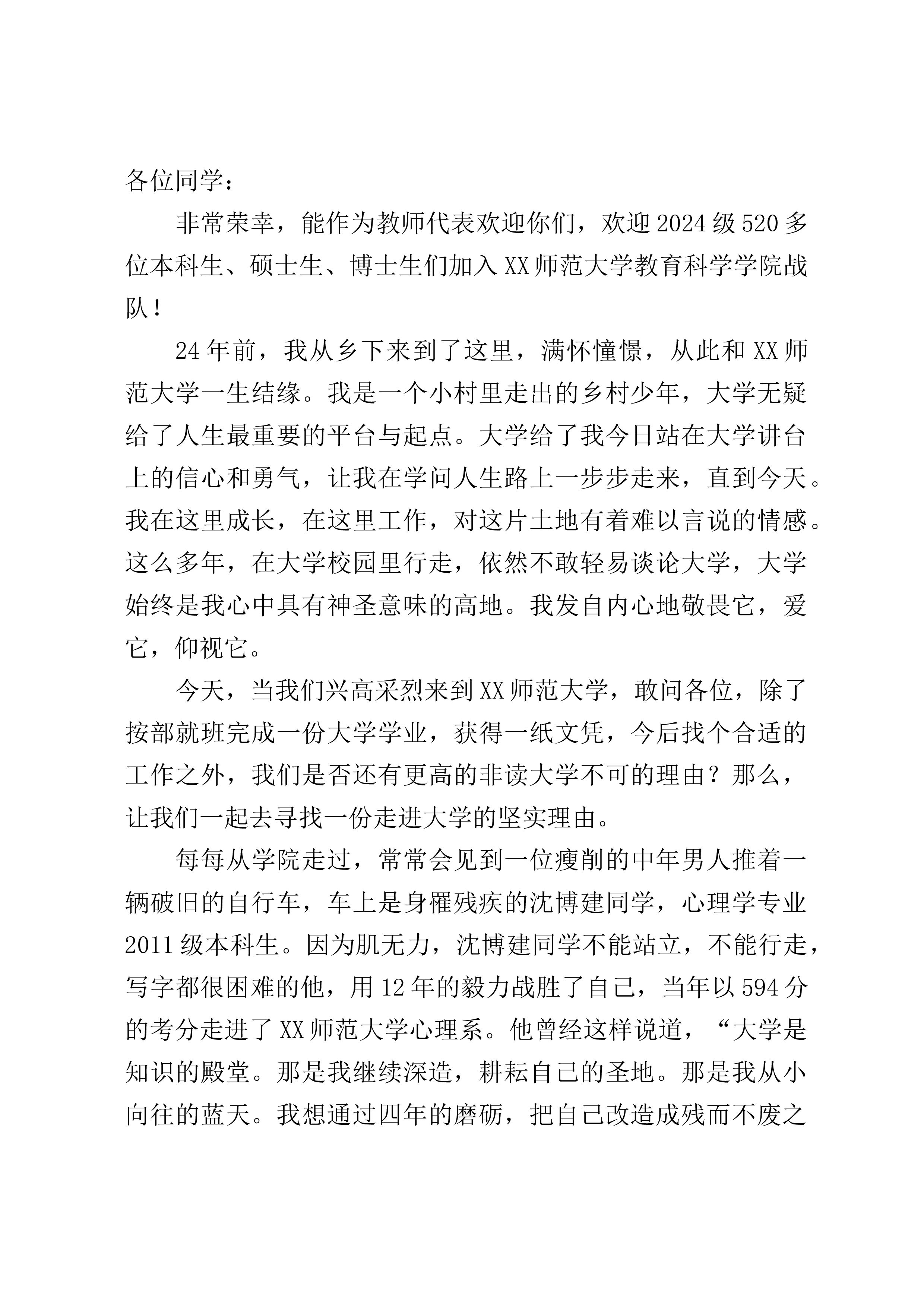 代表欢迎你们,欢迎2024级520多位本科生、硕士生、博士生们加入XX师范大学教育科学学院战队!24年前,我从乡下来到了这里,满怀憧憬,从此和XX师范大学一生结缘。我是一个小村里走出的乡村少年,大学无疑给了人生最重要的平台与起点。大学给了我今日站在大学讲台上的信心和勇气,让我在学问人生路上一步步走来,直到今天。我在这里成长,在这里工作,对这片土地有着难以言说的情感。这么多年,在大学校园里行走,依然不敢轻易谈论大学,大学始终是我心中具有神圣意味的高地。我发自内心地敬畏它,爱它,仰视它。今天,当我们兴高采烈来到XX师范大学,敢问各位,除了按部就班完成一份大学学业,获得...