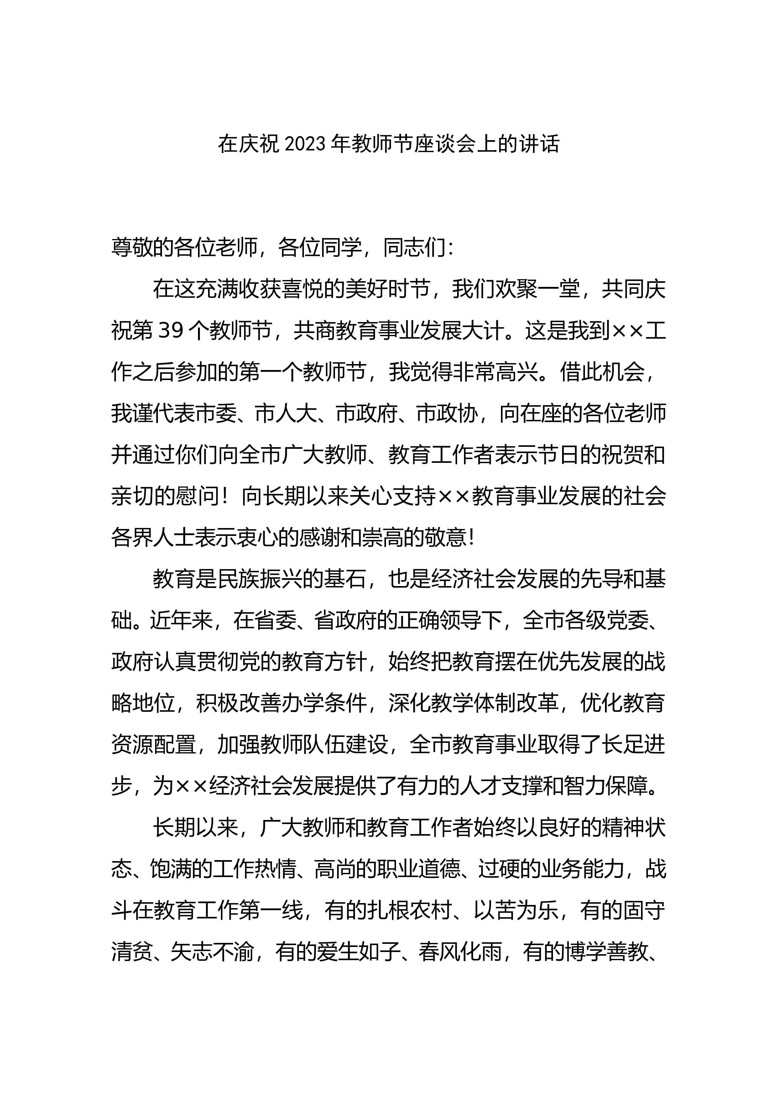 、教育工作者表示节日的祝贺和亲切的慰问!向长期以来关心支持××教育事业发展的社会各界人士表示衷心的感谢和崇高的敬意!教育是民族振兴的基石,也是经济社会发展的先导和基础。近年来,在省委、省政府的正确领导下,全市各级党委、政府认真贯彻党的教育方针,始终把教育摆在优先发展的战略地位,积极改善办学条件,深...