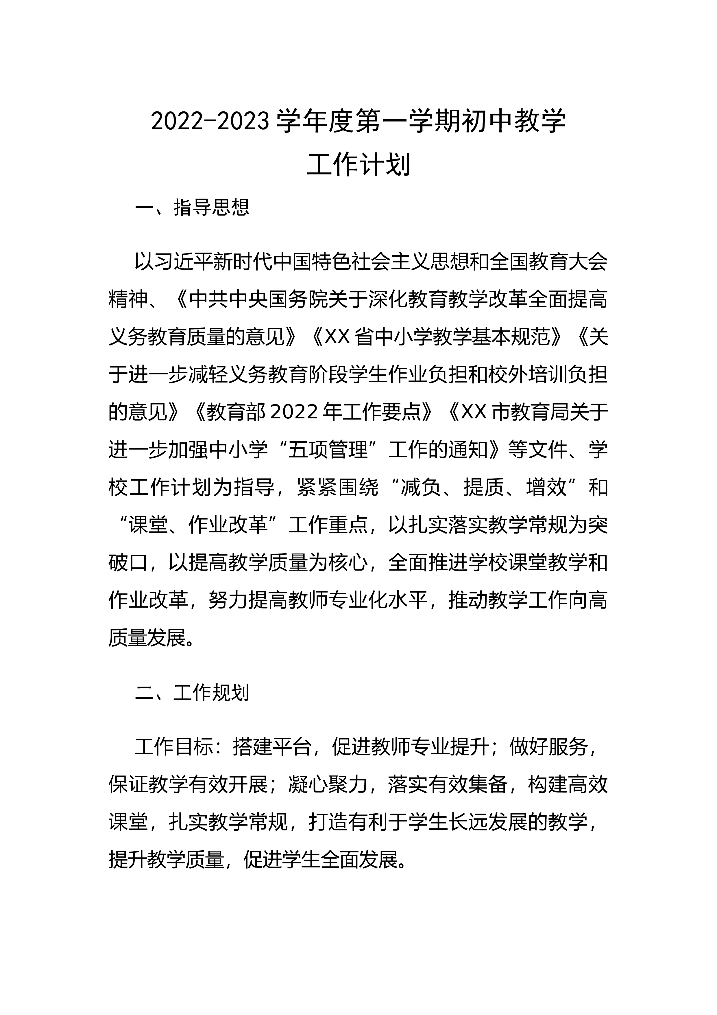2022-2023学年度第一学期初中教学工作计划一、指导思想以习近平新时代中国特色社会主义思想和全国教育大会精神、《中共中央国务院关于深化教育教学改革全面提高义务教育质量的意见》《XX省中小学教学基本规范》《关于进一步减轻义务教育阶段学生作业负担和校外培训负担的意见》《教育部2022年工作要点》《XX市教育局关于进一步加强中小学“五项管理”工作的通知》等文件、学校工作计划为指导,紧紧围绕“减负、提质、增效”和“课堂、作业改革”工作重点,以扎实落实教学常规为突破口,以提高教学质量为核心,全面推进学校课堂教学和作业改革,努力提高教师专业化水平,推动教学工作向高质量发展。二、工作规划工作目标:搭建平...