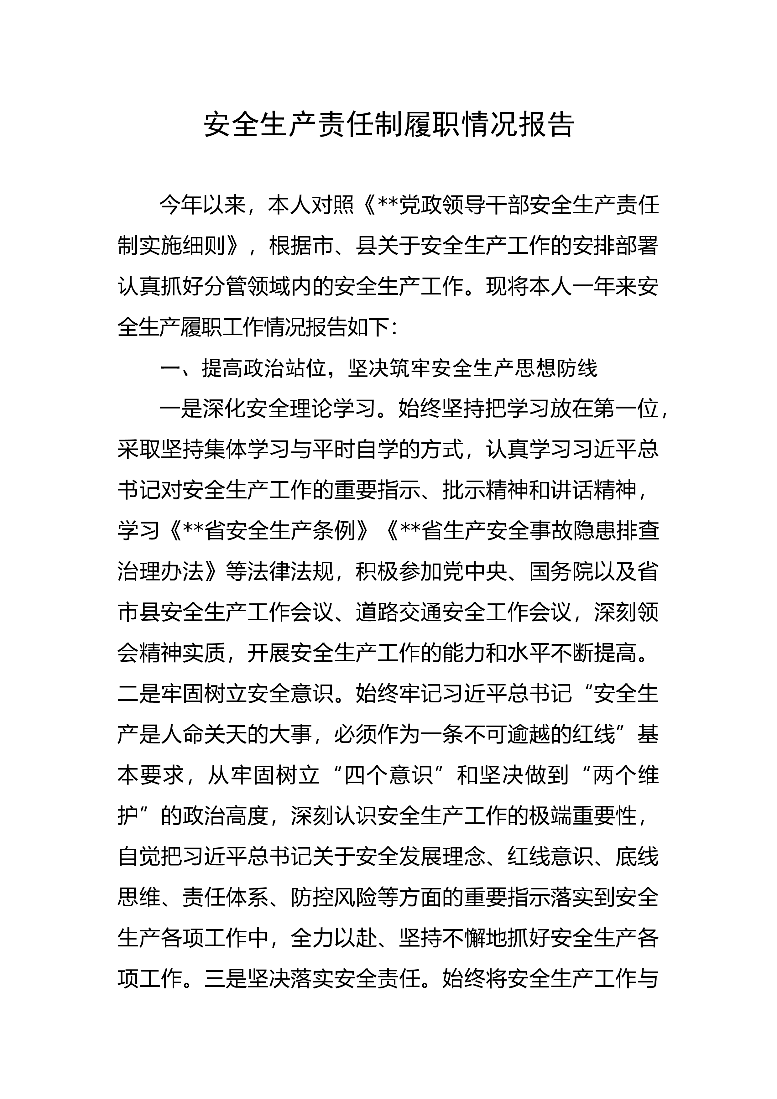 安全生产责任制履职情况报告今年以来,本人对照《**党政领导干部安全生产责任制实施细则》,根据市、县关于安全生产工作的安排部署认真抓好分管领域内的安全生产工作。现将本人一年来安全生产履职工作情况报告如下:一、提高政治站位,坚决筑牢安全生产思想防线一是深化安全理论学习。始终坚持把学习放在第一位,采取坚持集体学习与平时自学的方式,认真学习习近平总书记对安全生产工作的重要指示、批示精神和讲话精神,学习《**省安全生产条例》《**省生产安全事故隐患排查治理办法》等法律法规,积极参加党中央、国务院以及省市县安全生产工作会议、道路交通安全工作会议,深刻领会精神实质,开展安全生产工作的能力和水平不断提高。二是...